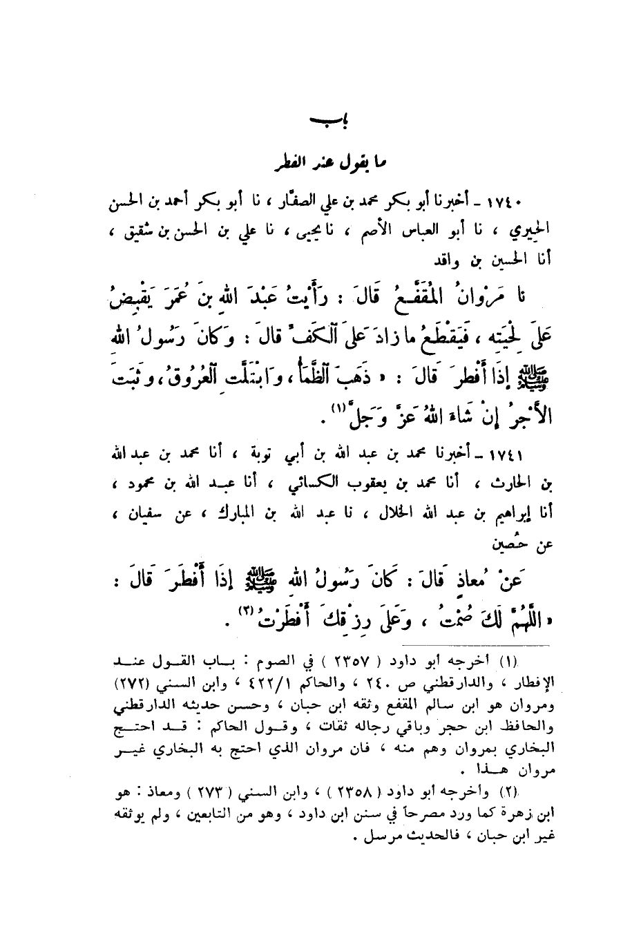1740 - أَخْبَرَنَا أَبُو بَكْرٍ مُحَمَّدُ بْنُ عَلِيٍّ الصَّفَّارُ، نَا أَبُو بَكْرٍ أَحْمَدُ بْنُ الْحَسَنِ الْحِيرِيُّ، نَا أَبُو الْعَبَّاسِ الْأَصَمُّ، نَا يَحْيَى، نَا عَلِيُّ بْنُ الْحَسَنِ بْنِ شَقِيقٍ، أَنا الْحُسَيْنُ بْنُ وَاقِدٍ نَا مَرْوَانُ الْمُقَفَّعُ، قَالَ: رَأَيْتُ عَبْدَ اللَّهِ بْنَ عُمَرَ يَقْبِضُ عَلَى لِحْيَتِهِ، فَيَقْطَعُ مَا زَادَ عَلَى الْكَفِّ، قَالَ: وَكانَ رَسُولُ اللَّهِ صَلَّى اللهُ عَلَيْهِ وَسَلَّمَ إِذَا أَفْطَرَ، قَالَ: «ذَهَبَ الظَّمَأُ، وَابْتَلَّتِ الْعُرُوقُ، وَثَبَتَ الْأَجْرُ إِنْ شَاءَ اللَّهُ عَزَّ وَجَلَّ»