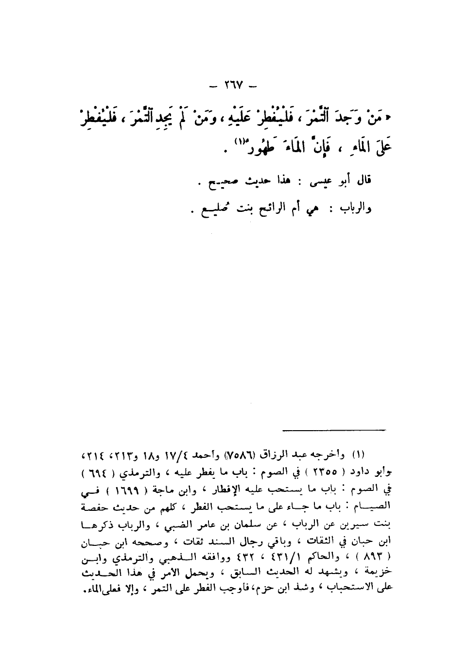مَنْ وَجَدَ التَّمْرَ، فَلْيُفْطِرْ عَلَيْهِ، وَمَنْ لَمْ يَجِدِ التَّمْرَ، فَلْيُفْطِرْ عَلَى الْمَاءِ، فَإِنَّ الْمَاءَ طَهُورٌ».