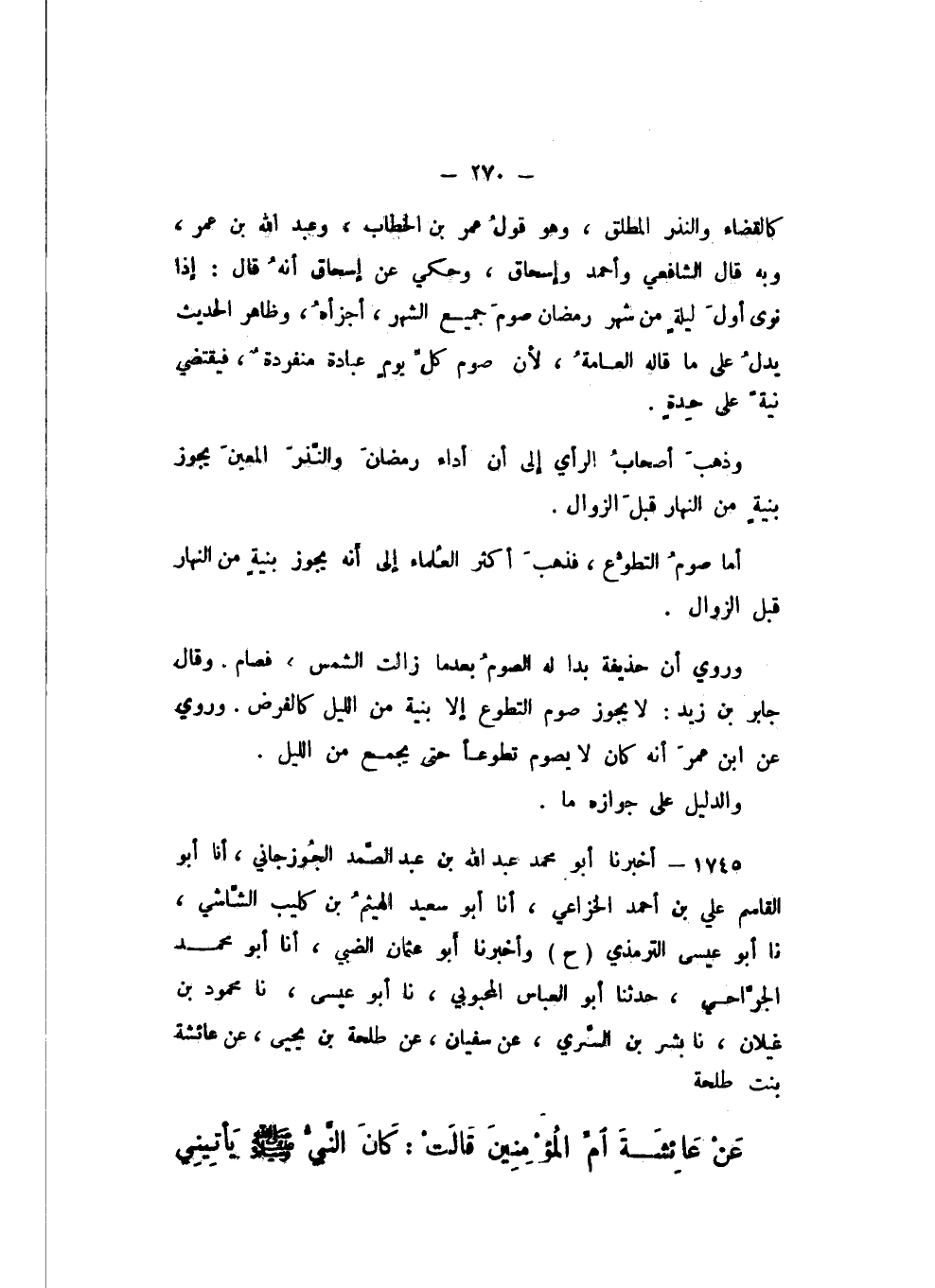 كَالْقَضَاءِ وَالنَّذْرِ الْمُطْلَقِ، وَهُوَ قَوْلُ عُمَرَ بْنِ الْخَطَّابِ، وَعَبْدِ اللَّهِ بْنِ عُمَرَ، وَبِهِ قَالَ الشَّافِعِيُّ، وَأَحْمَدُ، وَإِسْحَاقُ، وَحُكِيَ عَنْ إِسْحَاقَ، أَنَّهُ قَالَ: إِذَا نَوَى أَوَّلَ لَيْلَةٍ مِنْ شَهْرِ رَمَضَانَ صَوْمَ جَمِيعِ الشَّهْرِ، أَجْزَأَهُ، وَظَاهِرُ الْحَدِيثِ يَدُلُّ عَلَى مَا قَالَهُ الْعَامَّةُ، لِأَنَّ صَوْمَ كُلِّ يَوْمٍ عِبَادَةٌ مُنْفَرِدَةٌ، فَيَقْتَضِي نِيَّةً عَلَى حِدَةٍ.