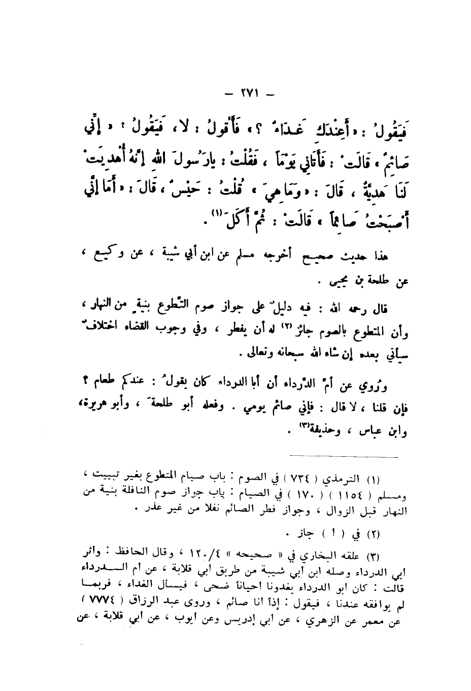 قَالَ رَحِمَهُ اللَّهُ: فِيهِ دَلِيلٌ عَلَى جَوَازِ صَوْمِ التَّطَوُّعِ بِنِيَّةٍ مِنَ النَّهَارِ، وَأَنَّ الْمُتَطَوِّعَ بِالصَّوْمِ جَائِزٌ لَهُ أَنْ يُفْطِرَ، وَفِي وُجُوبِ الْقَضَاءِ اخْتِلافٌ، سَيَأْتِي بَعْدَهُ، إِنْ شَاءَ اللَّهُ سُبْحَانَهُ وَتَعَالَى.