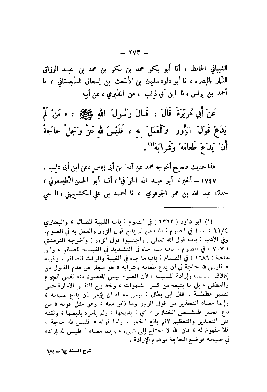 الشَّيْبَانِيُّ الْحَافِظُ، أَنا أَبُو بَكْرٍ مُحَمَّدُ بْنُ بَكْرِ بْنِ مُحَمَّدِ بْنِ عَبْدِ الرَّزَّاقِ التَّمَّارُ، بِالْبَصْرَةِ، نَا أَبُو دَاوُدَ سُلَيْمَانُ بْنُ الْأَشْعَثِ بْنِ إِسْحَاقَ السِّجِسْتَانِيُّ، نَا أَحْمَدُ بْنُ يُونُسَ، نَا ابْنُ أَبِي ذِئْبٍ، عَنِ الْمَقْبُرِيِّ، عَنْ أَبِيهِ، عَنْ أَبِي هُرَيْرَةَ، قَالَ: قَالَ رَسُولُ اللَّهِ صَلَّى اللهُ عَلَيْهِ وَسَلَّمَ: «مَنْ لَمْ يَدَعْ قَوْلَ الزُّورِ وَالْعَمَلَ بِهِ، فَلَيْسَ لِلَّهِ عَزَّ وَجَلَّ حَاجَةٌ أَنْ يَدَعَ طَعَامَهُ وَشَرَابَهُ».
