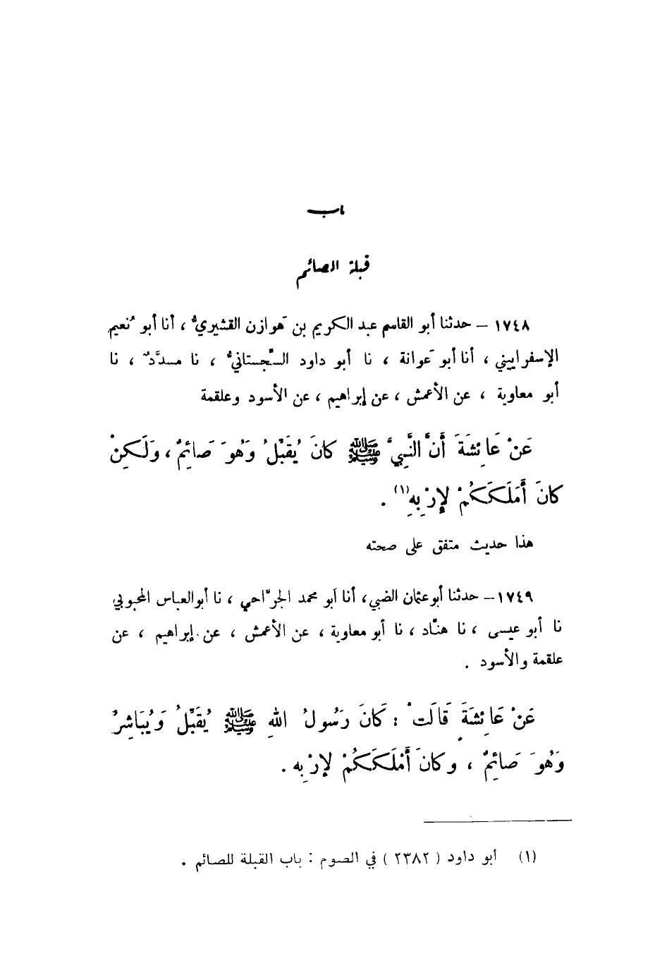 1748 - حَدَّثَنَا أَبُو الْقَاسِمِ عَبْدُ الْكَرِيمِ بْنُ هَوَازِنَ الْقُشَيْرِيُّ، أَنا أَبُو نُعَيْمٍ الإِسْفَرَايِينِيُّ، أَنا أَبُو عَوَانَةَ، نَا أَبُو دَاوُدَ السِّجِسْتَانِيُّ، نَا مُسَدَّدٌ، نَا أَبُو مُعَاوِيَةَ، عَنِ الْأَعْمَشِ، عَنْ إِبْرَاهِيمَ، عَنِ الْأَسْوَدِ، وَعَلْقَمَةَ، عَنْ عَائِشَةَ، «أَنَّ النَّبِيَّ صَلَّى اللهُ عَلَيْهِ وَسَلَّمَ كَانَ يُقَبِّلُ وَهُوَ صَائِمٌ، وَلَكِنْ كَانَ أَمْلَكَكُمْ لِإِرْبِهِ».