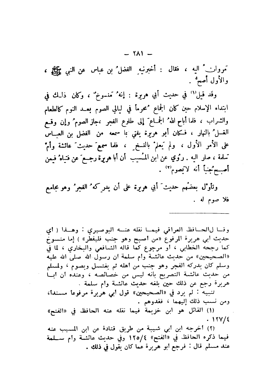 وَقَدْ قِيلَ فِي حَدِيثِ أَبِي هُرَيْرَةَ: إِنَّهُ مَنْسُوخٌ، وَكَانَ ذَلِكَ فِي ابْتِدَاءِ الإِسْلامِ حِينَ كَانَ الْجِمَاعُ مُحَرَّمًا فِي لَيَالِي الصَّوْمِ بَعْدَ النَّوْمِ كَالطَّعَامِ وَالشَّرَابِ، فَلَمَّا أَبَاحَ اللَّهُ الْجِمَاعَ إِلَى طُلُوعِ الْفَجْرِ، جَازَ الصَّوْمُ وَإِنْ وَقَعَ الْغُسْلُ بِالنَّهَارِ، فَكَانَ أَبُو هُرَيْرَةَ يُفْتِي بِمَا سَمِعَهُ مِنَ الْفَضْلِ بْنِ الْعَبَّاسِ عَلَى الْأَمْرِ الْأَوَّلِ، وَلَمْ يَعْلَمْ بِالنَّسْخِ، فَلَمَّا سَمِعَ حَدِيثَ عَائِشَةَ رَضِيَ اللَّهُ عَنْهَا، وَأُمِّ سَلَمَةَ، صَارَ إِلَيْهِ.