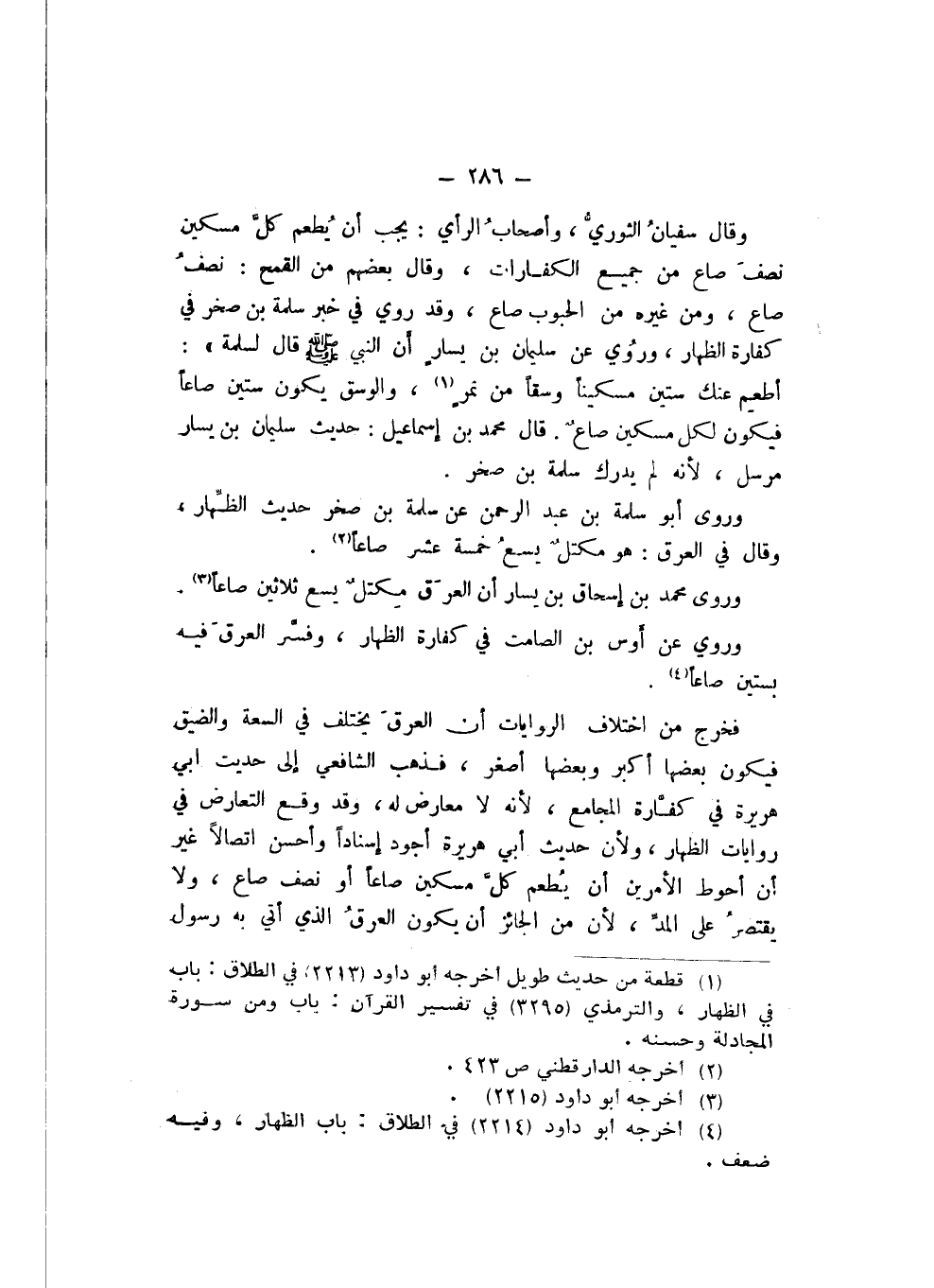 وَقَالَ سُفْيَانُ الثَّوْرِيُّ، وَأَصْحَابُ الرَّأْيِ: يَجِبُ أَنْ يُطْعَمَ كُلُّ مِسْكِينٍ نِصْفَ صَاعٍ مِنْ جَمِيعِ الْكَفَّارَاتِ، وَقَالَ بَعْضُهُمْ: مِنَ الْقَمْحِ نِصْفُ صَاعٍ، وَمِنْ غَيْرِهِ مِنَ الْحُبُوبِ صَاعٌ، وَقَدْ رُوِيَ فِي خَبَرِ سَلَمَةَ بْنِ صَخْرٍ فِي كَفَّارَةِ الظِّهَارِ، وَرُوِيَ عَنْ سُلَيْمَانَ بْنِ يَسَارٍ، أَنَّ النَّبِيَّ صَلَّى اللهُ عَلَيْهِ وَسَلَّمَ، قَالَ لِسَلَمَةَ: «أَطْعِمْ عَنْكَ سِتِّينَ مِسْكِينًا وَسَقًا مِنْ تَمْرٍ».
