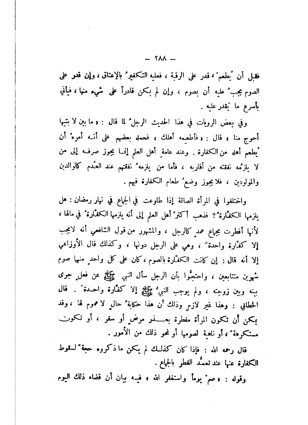 وَاخْتَلَفُوا فِي الْمَرْأَةِ الصَّائِمَةِ إِذَا طَاوَعَتْ فِي الْجِمَاعِ فِي نَهَارِ رَمَضَانَ، هَلْ يُلْزِمُهَا الْكَفَّارَةُ؟ فَذَهَبَ أَكْثَرُ أَهْلِ الْعِلْمِ إِلَى أَنَّهُ يُلْزِمُهَا الْكَفَّارَةُ فِي مَالِهَا؛ لِأَنَّهَا أَفْطَرَتْ بِجِمَاعِ عَمْدٍ كَالرَّجُلِ، وَالْمَشْهُورُ مِنْ قَوْلِ الشَّافِعِيِّ، أَنَّهُ لَا يَجِبُ إِلا كَفَّارَةٌ وَاحِدَةٌ، وَهِيَ عَلَى الرَّجُلِ دُونَهَا، وَكَذَلِكَ قَالَ الأَوْزَاعِيُّ، إِلا أَنَّهُ قَالَ: إِنْ كَانْتِ الْكَفَّارَةُ بِالصَّوْمِ، كَانَ عَلَى كُلِّ وَاحِدٍ مِنْهُمَا صَوْمُ شَهْرَيْنِ مُتَتَابِعَيْنِ.