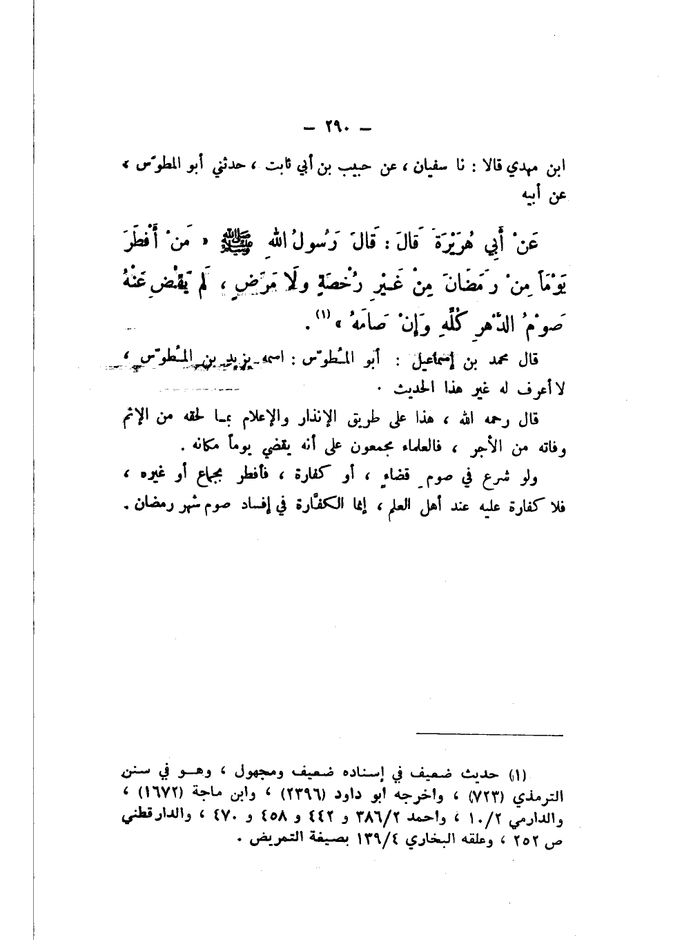 بْنُ مَهْدِيٍّ، قَالا: نَا سُفْيَانُ، عَنْ حَبِيبِ بْنِ أَبِي ثَابِتٍ، حَدَّثَنِي أَبُو الْمُطَوِّسِ، عَنْ أَبِيهِ، عَنْ أَبِي هُرَيْرَةَ، قَالَ: قَالَ رَسُولُ اللَّهِ صَلَّى اللهُ عَلَيْهِ وَسَلَّمَ: «مَنْ أفْطَرَ يَوْمًا مِنْ رَمَضَانَ مِنْ غَيْرِ رُخْصَةٍ وَلا مَرَضٍ، لَمْ يَقْضِ عَنْهُ صَوْمُ الدَّهْرِ كُلِّهِ، وَإِنْ صَامَهُ»
