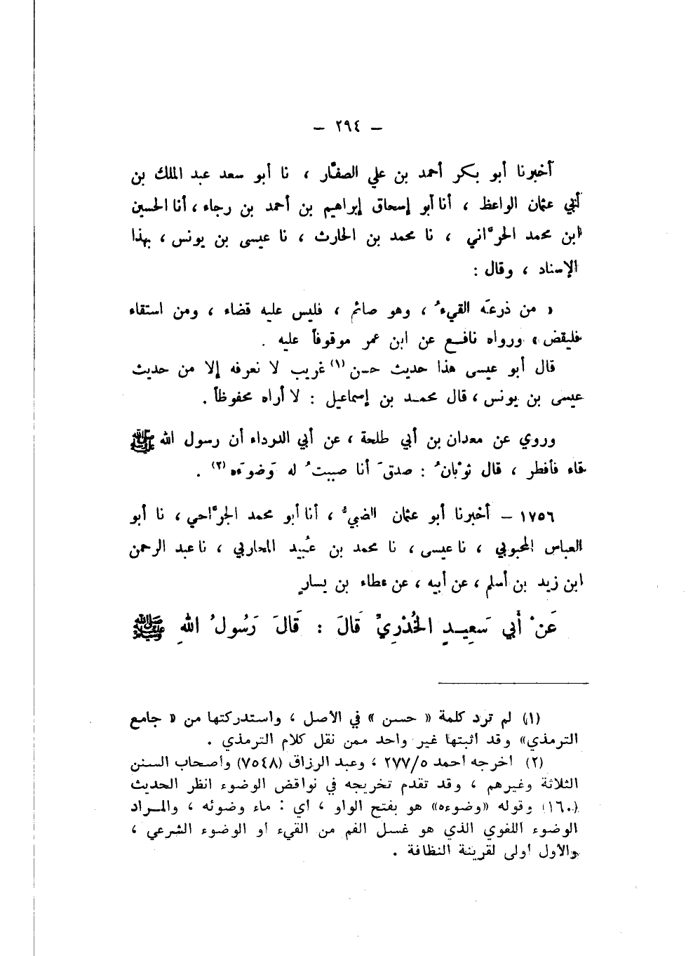 أَخْبَرَنَا أَبُو بَكْرٍ أَحْمَدُ بْنُ عَلِيٍّ الصَّفَّارُ، نَا أَبُو سَعْدٍ عَبْدُ الْمَلِكِ بْنُ أَبِي عُثْمَانَ الْوَاعِظُ، أنَا أَبُو إِسْحَاقَ إِبْرَاهِيمُ بْنُ رَجَاءٍ، أنَا الْحُسَيْنُ بْنُ مُحَمَّدٍ الْحَرَّانِيُّ، نَا مُحَمَّدُ بْنُ الْحَارِثِ، نَا عِيسَى بْنُ يُونُسَ، بِهَذَا الإِسْنَادِ، وَقَالَ: «مَنْ ذَرَعَهُ الْقَيْءُ، وَهُوَ صَائِمٌ، فَلَيْسَ عَلَيْهِ قَضَاءٌ، وَمَنِ اسْتَقَاءَ فَلْيَقْضِ».