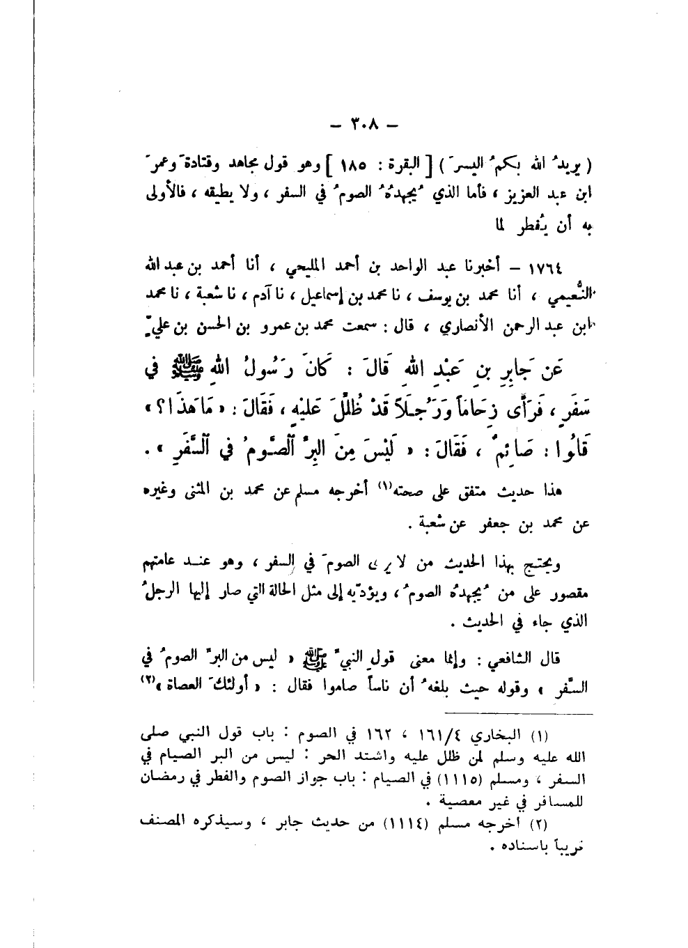قَالَ الشَّافِعِيُّ: وَإِنَّمَا مَعْنَى قَوْلِ النَّبِيِّ صَلَّى اللهُ عَلَيْهِ وَسَلَّمَ: «لَيْسَ مِنَ الْبِرِّ الصَّوْمُ فِي السَّفَرِ»، وَقَوْلُهُ حَيْثُ بَلَغَهُ أَنَّ نَاسًا صَامُوا، فَقَالَ: «أُولَئِكَ الْعُصَاةُ»،