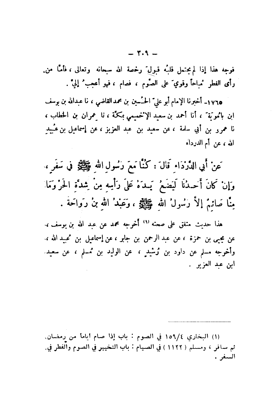 1765 - أَخْبَرَنَا الإِمَامُ أَبُو عَلِيٍّ الْحُسَيْنُ بْنُ مُحَمَّدٍ الْقَاضِي، نَا عَبْدُ اللَّهِ بْنُ يُوسُفَ بْنِ بَامُوَيْهِ، أَنا أَحْمَدُ بْنُ سَعِيدٍ الإِخْمِيمِيُّ، بِمَكَّةَ، نَا عِمْرَانُ بْنُ الْخَطَّابِ، نَا عَمْرُو بْنُ أَبِي سَلَمَةَ، عَنْ سَعِيدِ بْنِ عَبْدِ الْعَزِيزِ، عَنْ إِسْمَاعِيلَ بْنِ عُبَيْدِ اللَّهِ، عَنْ أُمِّ الدَّرْدَاءِ، عَنْ أَبِي الدَّرْدَاءِ، قَالَ: «كُنَّا مَعَ رَسُولِ اللَّهِ صَلَّى اللهُ عَلَيْهِ وَسَلَّمَ فِي سَفَرٍ، وَإِنْ كَانَ أَحدُنَا لَيَضَعُ يَدَهُ عَلَى رَأْسِهِ مِنْ شِدَّةِ الْحَرِّ، وَمَا مِنَّا صَائِمٌ إِلا رَسُولُ اللَّهِ صَلَّى اللهُ عَلَيْهِ وَسَلَّمَ، وَعَبْدُ اللَّهِ بْنُ رَوَاحَةَ».