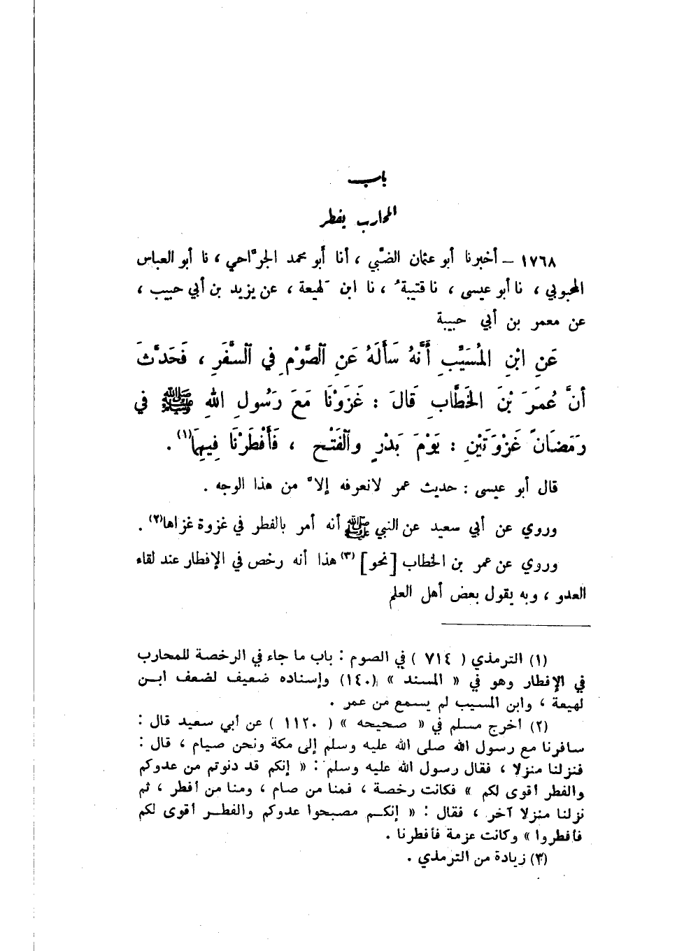 1768 - أَخْبَرَنَا أَبُو عُثْمَانَ الضَّبِّيُّ، أَنا أَبُو مُحَمَّدٍ الْجَرَّاحِيُّ، نَا أَبُو الْعَبَّاسِ الْمَحْبُوبِيُّ، نَا أَبُو عِيسَى، نَا قُتَيْبَةُ، نَا ابْنُ لَهِيعَةَ، عَنْ يَزِيدَ بْنِ أَبِي حَبِيبٍ، عَنْ مَعْمَرِ بْنِ أَبِي حَبِيبَةَ، عَنِ ابْنِ الْمُسَيِّبِ، أنَّهُ سَأَلَهُ عَنِ الصَّوْمِ فِي السَّفَرِ، فَحَدَّثَ أَنَّ عُمَرَ بْنَ الْخَطَّابِ، قَالَ: " غَزَوْنَا مَعَ رَسُولِ اللَّهِ صَلَّى اللهُ عَلَيْهِ وَسَلَّمَ فِي رَمَضَانَ غَزْوَتَيْنِ: يَوْمَ بَدْرٍ، وَالْفَتْحِ، فَأَفْطَرْنَا فِيهِمَا ".