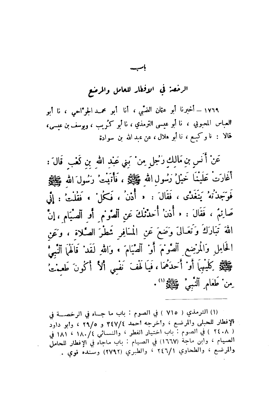 1769 - أَخْبَرَنَا أَبُو عُثْمَانَ الضَّبِّيُّ، أَنا أَبُو مُحَمَّدٍ الْجَرَّاحِيُّ، نَا أَبُو الْعَبَّاسِ الْمَحْبُوبِيُّ، نَا أَبُو عِيسَى التِّرْمِذِيُّ، نَا أَبُو كُرَيْبٍ، وَيُوسُفُ بْنُ عِيسَى، قَالا: نَا وَكِيعٌ، نَا أَبُو هِلالٍ، عَنْ عَبْدِ اللَّهِ بْنِ سَوَادَةَ، عَنْ أَنَسِ بْنِ مَالِكٍ، رَجُلٌ مِنْ بَنِي عَبْدِ اللَّهِ بْنِ كَعْبٍ، قَالَ: أَغَارَتْ عَلَيْنَا خَيْلُ رَسُولِ اللَّهِ صَلَّى اللهُ عَلَيْهِ وَسَلَّمَ، فَأَتَيْتُ رَسُولَ اللَّهِ صَلَّى اللهُ عَلَيْهِ وَسَلَّمَ، فَوَجَدْتُهُ يَتَغَدَّى، فَقَالَ: «ادْنُ، فَكُلْ»، فَقُلْتُ: إِنِّي صَائِمٌ، فَقَالَ: «ادْنُ أُحَدِّثْكَ عَنِ الصَّوْمِ أَوِ الصِّيَامِ، إِنَّ اللَّهَ تَبَارَكَ وَتَعَالَى وَضَعَ عَنِ الْمُسَافِرِ شَطْرَ الصَّلاةِ، وَعَنِ الْحَامِلِ، وَالْمُرْضِعِ الصَّوْمَ أَوِ الصِّيَامَ»، وَاللَّهِ لَقَدْ قَالَهُمَا النَّبِيُّ صَلَّى اللهُ عَلَيْهِ وَسَلَّمَ كِلَيْهِمَا أَوْ أَحَدَهُمَا، فَيَا لَهْفَ نَفْسِي أَلا أَكُونَ طَعِمْتُ مِنْ طَعَامِ النَّبِيِّ صَلَّى اللهُ عَلَيْهِ وَسَلَّمَ.
