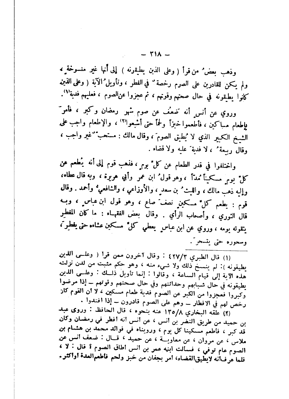 وَذَهَبَ بَعْضُ مَنْ قَرَأَ {وَعَلَى الَّذِينَ يُطِيقُونَهُ} [الْبَقَرَة: 184]، إِلَى أَنَّهَا غَيْرُ مَنْسُوخَةٍ، وَلَمْ يَكُنْ لِلْقَادِرِينَ عَلَى الصَّوْمِ رُخْصَةٌ فِي الْفِطْرِ، وَتَأْوِيلُ الْآيَةِ: وَعَلَى الَّذِينَ كَانُوا يُطِيقُونَهُ فِي حَالِ صِحَّتِهِمْ وَقُوَّتِهِمْ، ثُمَّ عَجَزُوا عَنِ الصَّوْمِ، فَعَلَيْهِمْ فِدْيَةٌ.