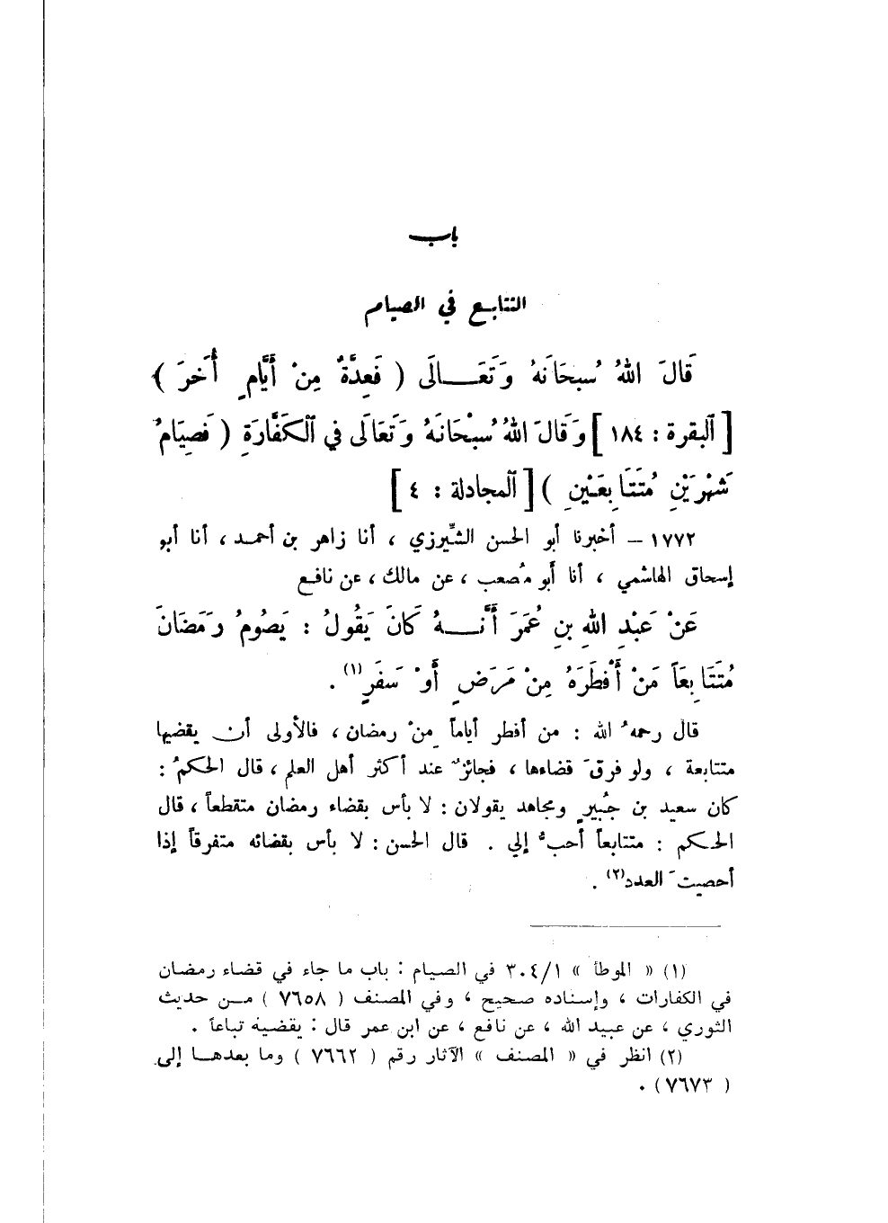 1772 - أَخْبَرَنَا أَبُو الْحَسَنِ الشِّيرَزِيُّ، أَنا زَاهِرُ بْنُ أَحْمَدَ، أَنا أَبُو إِسْحَاقَ الْهَاشِمِيُّ، أَنا أَبُو مُصْعَبٍ، عَنْ مَالِكٍ، عَنْ نَافِعٍ، عَنْ عَبْدِ اللَّهِ بْنِ عُمَرَ، أَنَّهُ كَانَ يَقُولُ: «يَصُومُ رَمَضَانَ مُتَتَابِعًا مَنْ أَفْطَرَهُ مِنْ مَرَضٍ أَوْ سَفَرٍ»