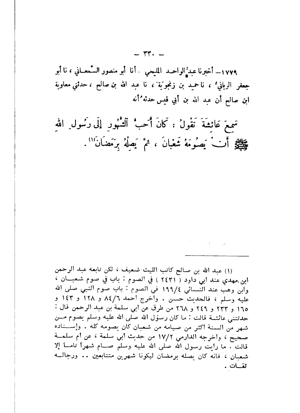 1779 - أَخْبَرَنَا عَبْدُ الْوَاحِدِ الْمَلِيحِيُّ، أَنا أَبُو مَنْصُورٍ السَّمْعَانِيُّ، نَا أَبُو جَعْفَرٍ الرَّيَّانِيُّ، نَا حُمَيْدُ بْنُ زَنْجُوَيْهِ، نَا عَبْدُ اللَّهِ بْنُ صَالِحٍ، حَدَّثَنِي مُعَاوِيَةُ بْنُ صَالِحٍ، أَنَّ عَبْدَ اللَّهِ بْنَ أَبِي قَيْسٍ، حَدَّثَهُ أَنَّهُ سَمِعَ عَائِشَةَ، تَقُولُ: «كَانَ أَحَبُّ الشُّهُورِ إِلَى رَسُولِ اللَّهِ صَلَّى اللهُ عَلَيْهِ وَسَلَّمَ أَنْ يَصُومَهُ شَعْبانَ، ثمَّ يَصِلُهُ بِرَمَضَانَ»