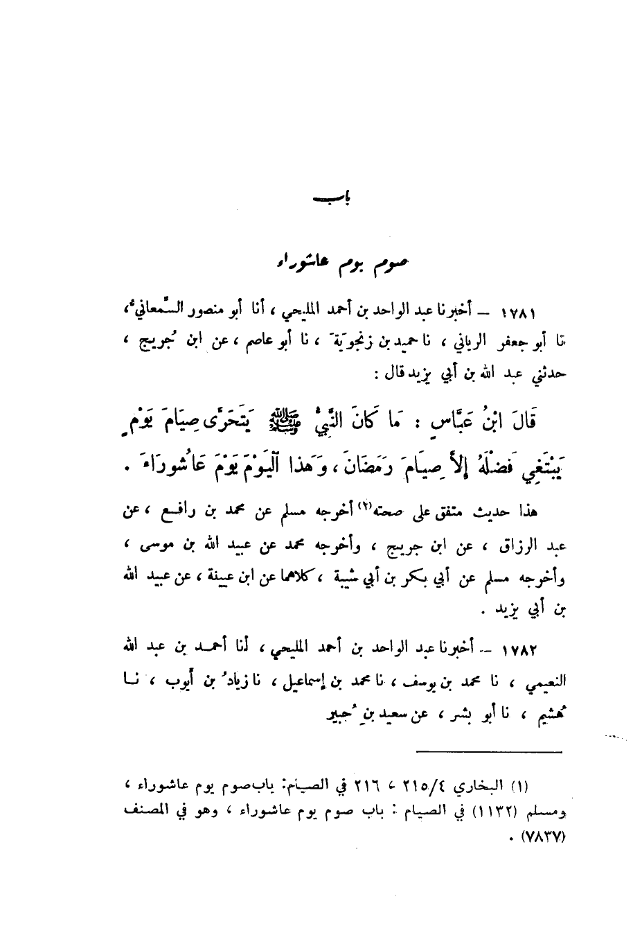 1781 - أَخْبَرَنَا عَبْدُ الْوَاحِدِ بْنُ أَحْمَدَ الْمَلِيحِيُّ، أَنا أَبُو مَنْصُورٍ السَّمْعَانِيُّ، نَا أَبُو جَعْفَرٍ الرَّيَّانِيُّ، نَا حُمَيْدُ بْنُ زَنْجُوَيْهِ، نَا أَبُو عَاصِمٍ، عَنِ ابْنِ جُرَيْجٍ، حَدَّثَنِي عَبْدُ اللَّهِ بْنُ أَبِي يَزِيدَ، قَالَ: قَالَ ابْنُ عَبَّاسٍ: «مَا كَانَ النَّبِيُّ صَلَّى اللهُ عَلَيْهِ وَسَلَّمَ يَتَحَرَّى صِيَامَ يَوْمٍ يَبْتَغِي فَضْلَهُ إِلا صِيَامَ رَمَضَانَ، وَهَذَا الْيَوْمَ يَوْمَ عَاشُورَاءَ».