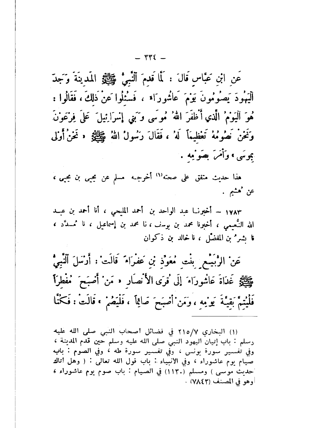 1783 - أَخْبَرَنَا عَبْدُ الْوَاحِدِ بْنُ أَحْمَدَ الْمَلِيحِيُّ، أَنا أَحْمَدُ بْنُ عَبْدِ اللَّهِ النُّعَيْمِيُّ، نَا مُحَمَّدُ بْنُ يُوسُفَ، نَا مُحَمَّدُ بْنُ إِسْمَاعِيلَ، نَا مُسدَّدٌ، نَا بِشْرُ بْنُ الْمُفَضَّلِ، نَا خَالِدُ بْنُ ذَكْوَانَ، عَنِ الرُّبَيِّعِ بِنْتِ مُعَوِّذِ ابْنِ عَفْرَاءَ، قَالَتْ: أَرْسَلَ النَّبِيُّ صَلَّى اللهُ عَلَيْهِ وَسَلَّمَ غَدَاةَ عَاشُورَاءَ إِلَى قُرَى الأَنْصَارِ، «مَنْ أَصْبَحَ مُفْطِرًا فَلْيُتِمَّ بَقِيَّةَ يَوْمِهِ، وَمَنْ أَصْبَحَ صَائِمًا، فَلْيَصُمْ»، قَالَتْ: فَكُنَّا