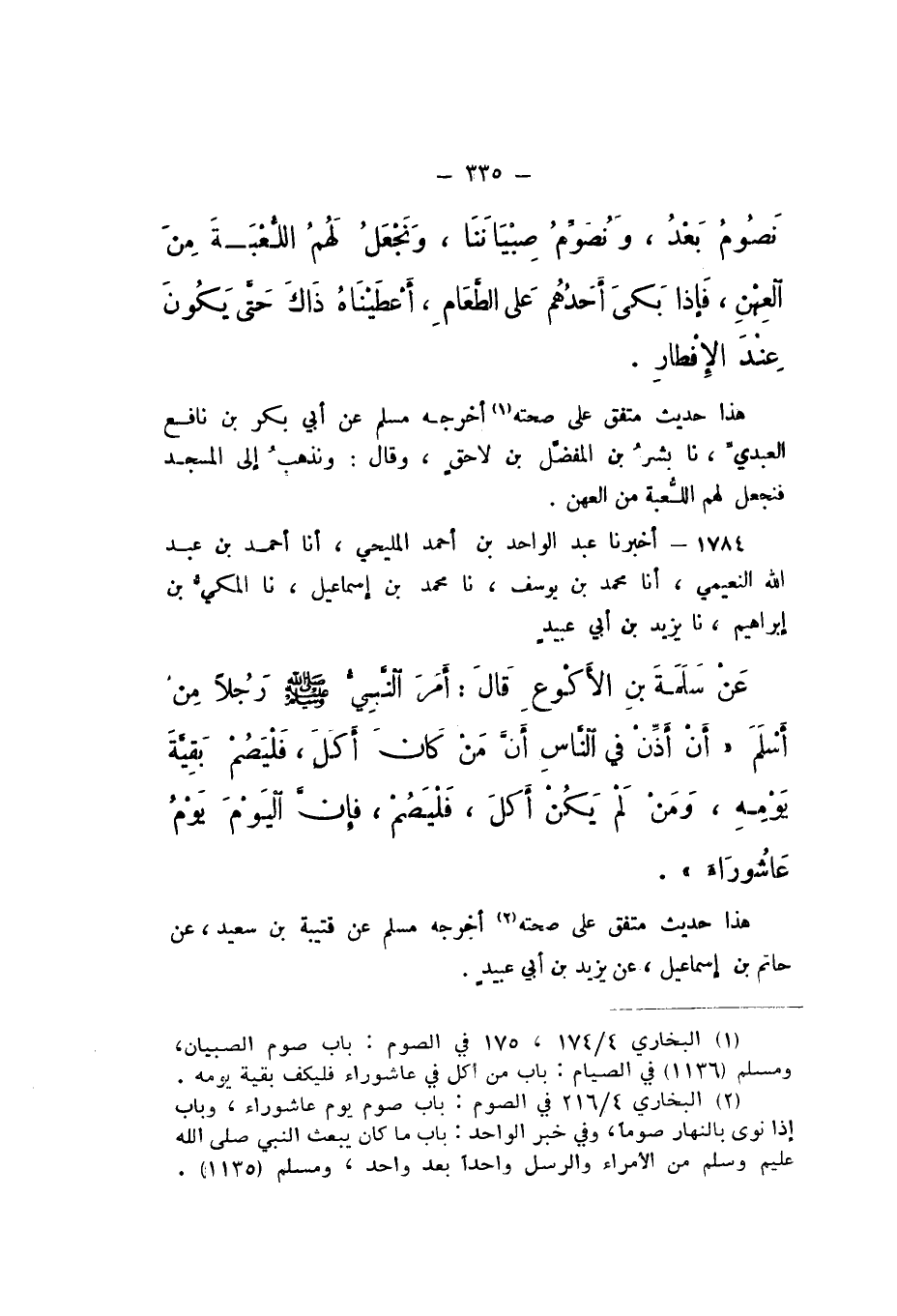 1784 - أَخْبَرَنَا عَبْدُ الْوَاحِدِ بْنُ أَحْمَدَ الْمَلِيحِيُّ، أَنا أَحْمَدُ بْنُ عَبْدِ اللَّهِ النُّعَيْمِيُّ، أَنا مُحَمَّدُ بْنُ يُوسُفَ، نَا مُحَمَّدُ بْنُ إِسْمَاعِيلَ، نَا الْمَكِّيُّ بْنُ إِبْرَاهِيمَ، نَا يَزِيدُ بْنُ أَبِي عُبَيْدٍ، عَنْ سَلَمَةَ بْنِ الأَكْوَعِ، قَالَ: أَمَرَ النَّبِيُّ صَلَّى اللهُ عَلَيْهِ وَسَلَّمَ رَجُلا مِنْ أَسْلَمَ، «أَنْ أَذِّنْ فِي النَّاسِ أَنَّ مَنْ كَانَ أَكَلَ، فَلْيَصُمْ بَقِيَّةَ يَوْمِهِ، وَمَنْ لَمْ يَكُنْ أَكَلَ، فَلْيَصُمْ، فَإِنَّ الْيَوْمَ يَوْمُ عَاشُورَاءَ».