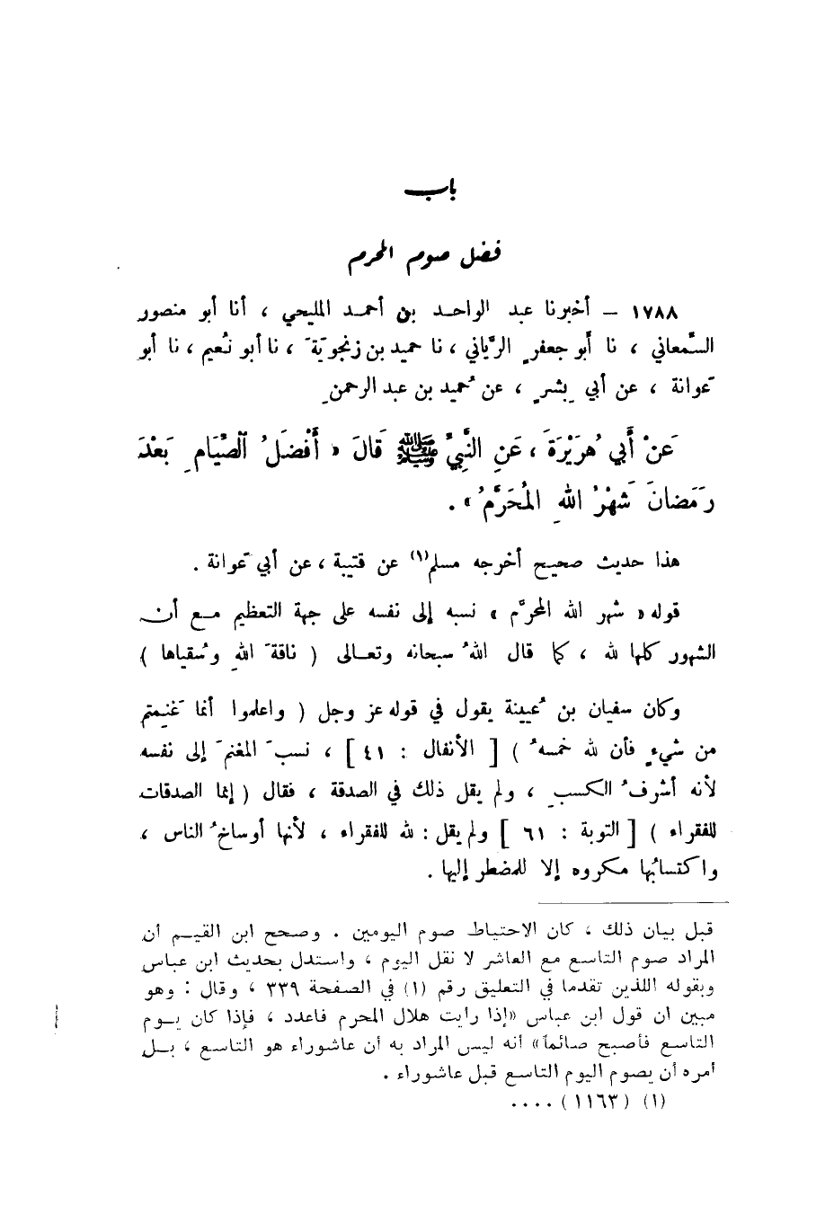 1788 - أَخْبَرَنَا عَبْدُ الْوَاحِدِ بْنُ أَحْمَدَ الْمَلِيحِيُّ، أَنا أَبُو مَنْصُورٍ السَّمْعَانِيُّ، نَا أَبُو جَعْفَرٍ الرَّيَّانِيُّ، نَا حُمَيْدُ بْنُ زَنْجُوَيْهِ، نَا أَبُو نُعَيْمٍ، نَا أَبُو عَوَانَةَ، عَنْ أَبِي بِشْرٍ، عَنْ حُمَيْدِ بْنِ عَبْدِ الرَّحْمَنِ، عَنْ أَبِي هُرَيْرَةَ، عَنِ النَّبِيِّ صَلَّى اللهُ عَلَيْهِ وَسَلَّمَ، قَالَ: «أَفْضَلُ الصِّيَامِ بَعْدَ رَمَضَانَ شَهْرُ اللَّهِ الْمُحَرَّمُ».