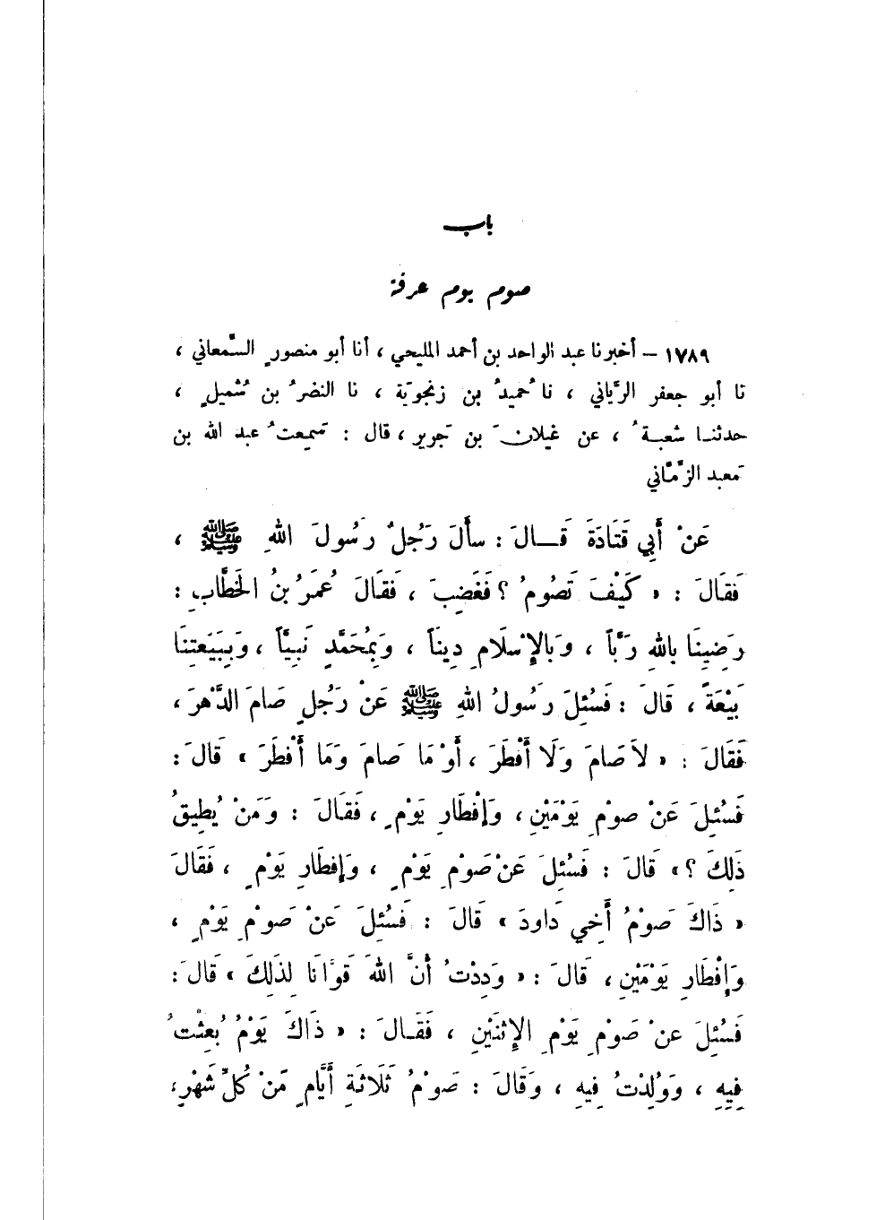 1789 - أَخْبَرَنَا عَبْدُ الْوَاحِدِ بْنُ أَحْمَدَ الْمَلِيحِيُّ، أَنا أَبُو مَنْصُورٍ السَّمْعَانِيُّ، نَا أَبُو جَعْفَرٍ الرَّيَّانِيُّ، نَا حُمَيْدُ بْنُ زَنْجُوَيْهِ، نَا النَّضْرُ بْنُ شُمَيْلٍ، حَدَّثَنَا شُعْبَةُ، عَنْ غَيْلانَ بْنِ جَرِيرٍ، قَالَ: سَمِعْتُ عَبْدَ اللَّهِ بْنَ مَعْبَدٍ الزِّمَّانِيَّ، عَنْ أَبِي قَتَادَةَ، قَالَ: سَأَلَ رَجُلٌ رَسُولَ اللَّهِ صَلَّى اللهُ عَلَيْهِ وَسَلَّمَ، فَقَالَ: كَيْفَ تَصُومُ؟ فَغَضِبَ، فَقَالَ عُمَرُ بْنُ الْخَطَّابِ: رَضِينَا بِاللَّهِ رَبًّا، وَبِالإِسْلامِ دِينًا، وَبِمُحَمَّدٍ نَبِيًّا، وَبِبَيْعَتِنَا بَيْعَةً، قَالَ: فَسُئِلَ رَسُولُ اللَّهِ صَلَّى اللهُ عَلَيْهِ وَسَلَّمَ عَنْ رَجُلٍ صَامَ الدَّهْرَ، فَقَالَ: «لَا صَامَ وَلا أَفْطَرَ»، أَوْ «مَا صَامَ وَمَا أَفْطَرَ»، قَالَ: فَسُئِلَ عَنْ صَوْمِ يَوْمَيْنِ، وَإِفْطَارِ يَوْمٍ، فَقَالَ: «وَمَنْ يُطِيقُ ذَلِكَ؟»، قَالَ: فَسُئِلَ عَنْ صَوْمِ يَوْمٍ، وَإِفْطَارِ يَوْمٍ، فَقَالَ: «ذَاكَ صَوْمُ أَخِي دَاوُدَ»، قَالَ: فَسُئِلَ عَنْ صَوْمِ يَوْمٍ، وَإِفْطَارِ يَوْمَيْنِ، قَالَ: «وَدِدْتُ أَنَّ اللَّهَ قَوَّانَا لِذَلِكَ»، قَالَ: فَسُئِلَ عَنْ صَوْمِ يَوْمِ الاثْنَيْنِ، فَقَالَ: " ذَاكَ يَوْمُ بُعِثْتُ فِيهِ، وَوُلِدْتُ فِيهِ، وَقَالَ: صَوْمُ ثَلاثَةِ أَيَّامٍ مِنْ كُلِّ شَهْرٍ،