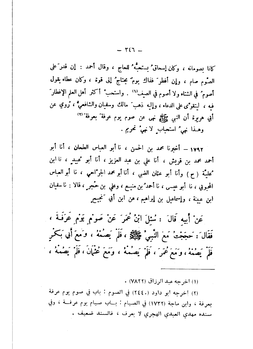 ح وَأَنا أَبُو عُثْمَانَ الضَّبِّيُّ، أَنا أَبُو مُحَمَّدٍ الْجَرَّاحِيُّ، نَا أَبُو الْعَبَّاسِ الْمَحْبُوبِيُّ، نَا أَبُو عِيسَى، نَا أَحْمَدُ بْنُ مَنِيعٍ، وَعَلِيُّ بْنُ حُجْرٍ، قَالا: نَا سُفْيَانُ بْنُ عُيَيْنَةَ، وَإِسْمَاعِيلُ بْنُ إِبْرَاهِيمَ، عَنِ ابْنِ أَبِي نَجِيحٍ، عَنْ أَبِيهِ، قَالَ: سُئِلَ ابْنُ عُمَرَ عَنْ صَوْمِ يَوْمِ عَرَفَةَ، فَقَالَ: «حَجَجْتُ مَعَ النَّبِيِّ صَلَّى اللهُ عَلَيْهِ وَسَلَّمَ فَلَمْ يَصُمْهُ، وَمَعَ أَبِي بَكْرٍ فَلَمْ يَصُمْهُ، وَمَعَ عُمَرَ فَلَمْ يَصُمْهُ، وَمَعَ عُثْمَانَ فَلَمْ يَصُمْهُ،