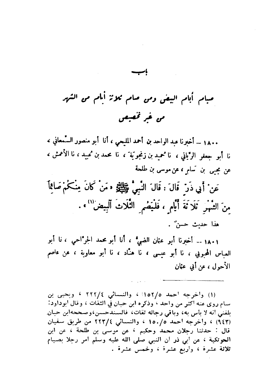 1800 - أَخْبَرَنَا عَبْدُ الْوَاحِدِ بْنُ أَحْمَدَ الْمَلِيحِيُّ، أَنا أَبُو مَنْصُورٍ السَّمْعَانِيُّ، نَا أَبُو جَعْفَرٍ الرَّيَّانِيُّ، نَا حُمَيْدُ بْنُ زَنْجُوَيْهِ، نَا مُحَمَّدُ بْنُ عُبَيْدٍ، نَا الأَعْمَشُ، عَنْ يَحْيَى بْنِ سَامٍ، عَنْ مُوسَى بْنِ طَلْحَةَ، عَنْ أَبِي ذَرٍّ، قَالَ: قَالَ النَّبِيُّ صَلَّى اللهُ عَلَيْهِ وَسَلَّمَ: «مَنْ كَانَ مِنْكُمْ صَائِمًا مِنَ الشَّهْرِ ثَلاثَةَ أَيَّامٍ، فَلْيَصُمِ الثَّلاثَ الْبِيضَ».