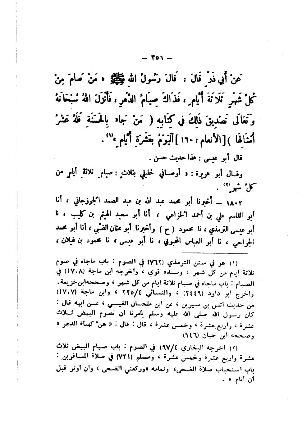 عَنْ أَبِي ذَرٍّ، قَالَ: قَالَ رَسُولُ اللَّهِ صَلَّى اللهُ عَلَيْهِ وَسَلَّمَ: " مَنْ صَامَ مِنْ كُلِّ شَهْرٍ ثَلاثَةَ أَيَّامٍ، فَذَاكَ صِيَامُ الدَّهْرِ، فَأَنْزَلَ اللَّهُ سُبْحَانَهُ وَتَعَالَى تَصْدِيقَ ذَلِكَ فِي كِتَابِهِ: {مَنْ جَاءَ بِالْحَسَنَةِ فَلَهُ عَشْرُ أَمْثَالِهَا} [الْأَنْعَام: 160]، الْيَوْمُ بِعَشَرَةِ أَيَّامٍ ".