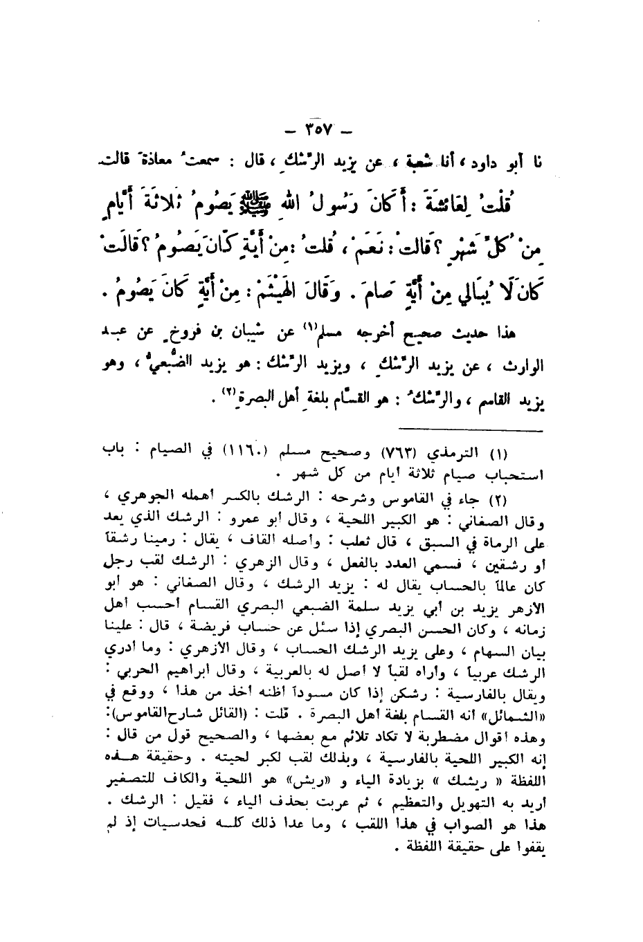 نَا أَبُو دَاوُدَ، أَنا شُعْبَةُ، عَنْ يَزِيدَ الرِّشْكِ، قَالَ: سَمِعْتُ مُعَاذَةَ، قَالَتْ: قُلْتُ لِعَائِشَةَ: أَكَانَ رَسُولُ اللَّهِ صَلَّى اللهُ عَلَيْهِ وَسَلَّمَ يَصُومُ ثَلاثَةَ أَيَّامٍ مِنْ كُلِّ شَهْرٍ؟ قَالَتْ: «نَعَمْ»، قُلْتُ: مِنْ أَيَّةٍ كَانَ يَصُومُ؟ قَالَتْ: «كَانَ لَا يُبَالِي مِنْ أَيَّةٍ صَامَ».