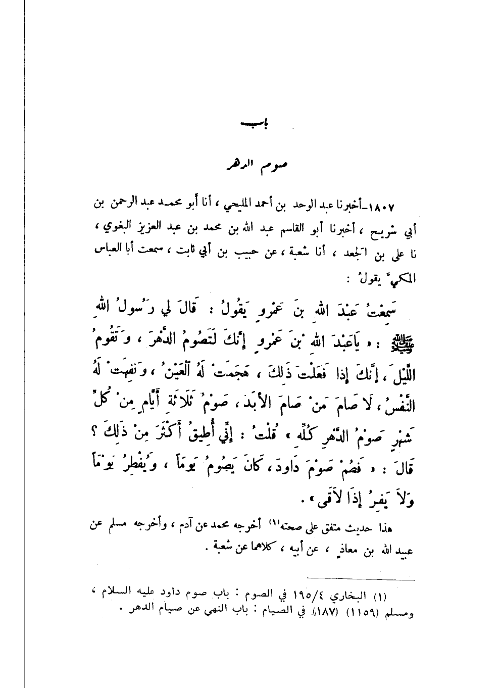 1807 - أَخْبَرَنَا عَبْدُ الْوَاحِدِ بْنُ أَحْمَدَ الْمَلِيحِيُّ، أَنا أَبُو مُحَمَّدٍ عَبْدُ الرَّحْمَنِ بْنُ أَبِي شُرَيْحٍ، نَا أَبُو الْقَاسِمِ عَبْدُ اللَّهِ بْنُ مُحَمَّدِ بْنِ عَبْدِ الْعَزِيزِ الْبَغَوِيُّ، نَا عَلِيُّ بْنُ الْجَعْدِ، أَنا شُعْبَةُ، عَنْ حَبِيبِ بْنِ أَبِي ثَابِتٍ، سَمِعْتُ أَبَا الْعَبَّاسِ الْمَكِّيَّ، يَقُولُ: سَمِعْتُ عَبْدَ اللَّهِ بْنَ عَمْرٍو، يَقُولُ: قَالَ لِي رَسُولُ اللَّهِ صَلَّى اللهُ عَلَيْهِ وَسَلَّمَ: «يَا عَبْدَ اللَّهِ بْنَ عَمْرٍو، إِنَّكَ لَتَصُومُ الدَّهْرَ، وَتَقُومُ اللَّيْلَ، إِنَّكَ إِذَا فَعَلْتَ ذَلِكَ، هَجَمَتْ لَهُ الْعَيْنُ، وَنفهت لَهُ النَّفْسُ، لَا صَامَ مَنْ صَامَ الأَبَدَ، صَوْمُ ثَلاثَةِ أَيَّامٍ مِنْ كُلِّ شَهْرٍ صَوْمُ الدَّهْرِ كُلِّهِ»، قُلْتُ: إِنِّي أُطِيقُ أَكْثَرَ مِنْ ذَلِكَ؟ قَالَ: «فَصُمْ صَوْمَ دَاوُدَ، كَانَ يَصُومُ يَوْمًا، وَيُفْطِرُ يَوْمًا، وَلا يَفِرُّ إِذَا لاقَى».