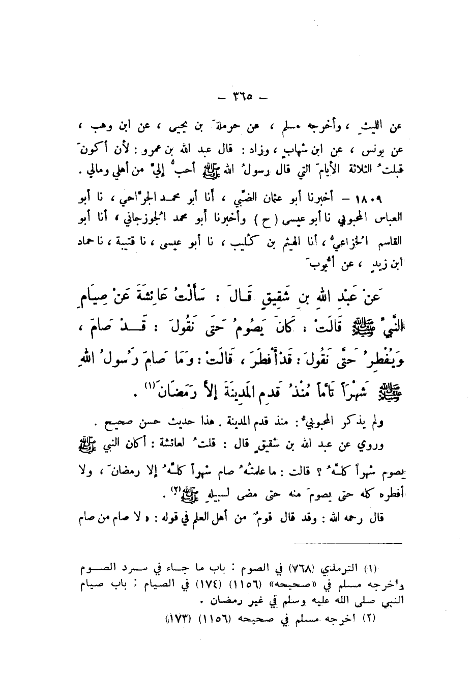 ح وَأَخْبَرَنَا أَبُو مُحَمَّدٍ الْجَوْزَجَانِيُّ، أَنا أَبُو الْقَاسِمِ الْخُزَاعِيُّ، أَنا الْهَيْثَمُ بْنُ كُلَيْبٍ، نَا أَبُو عِيسَى، نَا قُتَيْبَةُ، نَا حَمَّادُ بْنُ زَيْدٍ، عَنْ أَيُّوبَ، عَنْ عَبْدِ اللَّهِ بْنِ شَقِيقٍ، قَالَ: سَأَلْتُ عَائِشَةَ عَنْ صِيَامِ النَّبِيِّ صَلَّى اللهُ عَلَيْهِ وَسَلَّمَ، قَالَتْ: " كَانَ يَصُومُ حَتَّى نَقُولَ: قَدْ صَامَ، وَيُفْطِرُ حَتَّى نَقُولَ: قَدْ أَفْطَرَ، قَالَتْ: وَمَا صَامَ رَسُولُ اللَّهِ صَلَّى اللهُ عَلَيْهِ وَسَلَّمَ شَهْرًا تَامًّا مُنْذُ قَدِمَ الْمَدِينَةَ إِلا رَمَضَانَ ".