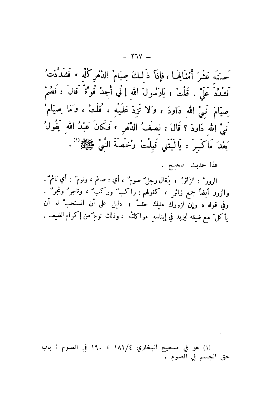 حَسَنَةٍ عَشْرَ أَمْثَالِهَا، فَإِذَا ذَلِكَ صِيَامُ الدَّهْرِ كُلِّهِ»، فَشَدَّدْتُ فَشَدَّدَ عَلَيَّ، قُلْتُ: يَا رَسُولَ اللَّهِ، إِنِّي أَجِدُ قُوَّةً، قَالَ: «فَصُمْ صِيَامَ نَبِيِّ اللَّهِ دَاوُدَ، وَلا تَزِدْ عَلَيْهِ»، قُلْتُ: وَمَا صِيَامُ نَبِيِّ اللَّهِ دَاوُدَ؟ قَالَ: «نِصْفُ الدَّهْرِ»، فَكَانَ عَبْدُ اللَّهِ يَقُولُ بَعْدَ مَا كَبِرَ: يَا لَيْتَنِي قَبِلْتُ رُخْصَةَ النَّبِيِّ صَلَّى اللهُ عَلَيْهِ وَسَلَّمَ.