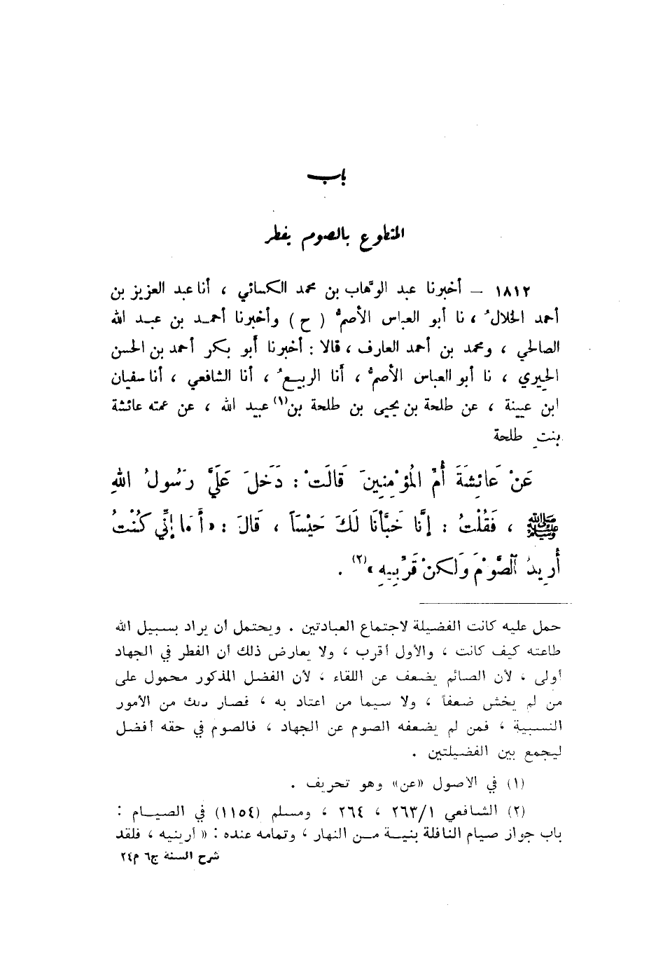 ح وَأَخْبَرَنَا أَحْمَدُ بْنُ عَبْدِ اللَّهِ الصَّالِحِيُّ، وَمُحَمَّدُ بْنُ أَحْمَدَ الْعَارِفُ، قَالا: أَخْبَرَنَا أَبُو بَكْرٍ أَحْمَدُ بْنُ الْحَسَنِ الْحِيرِيُّ، نَا أَبُو الْعَبَّاسِ الأَصَمُّ، أَنا الرَّبِيعُ، أَنا الشَّافِعِيُّ، أَنا سُفْيَانُ بْنُ عُيَيْنَةَ، عَنْ طَلْحَةَ بْنِ يَحْيَى بْنِ طَلْحَةَ بْنِ عُبَيْدِ اللَّهِ، عَنْ عَمَّتِهِ عَائِشَةَ بِنْتِ طَلْحَةَ، عَنْ عَائِشَةَ أُمِّ الْمُؤْمِنِينَ، قَالَتْ: دَخَلَ عَلَيَّ رَسُولُ اللَّهِ صَلَّى اللهُ عَلَيْهِ وَسَلَّمَ، فَقُلْتُ: إِنَّا خَبَّأْنَا لَكَ حَيْسًا، قَالَ: «أَمَا إِنِّي كُنْتُ أُرِيدُ الصَّوْمَ، وَلَكِنْ قَرِّبِيهِ».