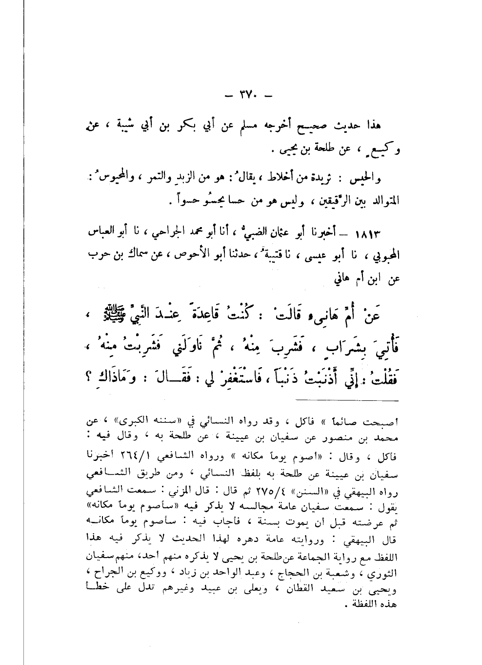 1813 - أَخْبَرَنَا أَبُو عُثْمَانَ الضَّبِّيُّ، أَنا أَبُو مُحَمَّدٍ الْجَرَّاحِيُّ، نَا أَبُو الْعَبَّاسِ الْمَحْبُوبِيُّ، نَا أَبُو عِيسَى، نَا قُتَيْبَةُ، حَدَّثَنَا أَبُو الأَحْوَصِ، عَنْ سِمَاكِ بْنِ حَرْبٍ، عَنِ ابْنِ أُمِّ هَانِئٍ، عَنْ أُمِّ هَانِئٍ، قَالَتْ: كُنْتُ قَاعِدةً عِنْدَ النَّبِيِّ صَلَّى اللهُ عَلَيْهِ وَسَلَّمَ، فَأُتِيَ بِشَرَابٍ، فَشَرِبَ مِنْهُ، ثُمَّ نَاوَلَنِي فَشَرِبْتُ مِنْهُ، فَقُلْتُ: إِنِّي أَذْنَبْتُ ذَنْبًا، فَاسْتَغْفِرْ لِي، فَقَالَ: «وَمَا ذَاكَ؟»،