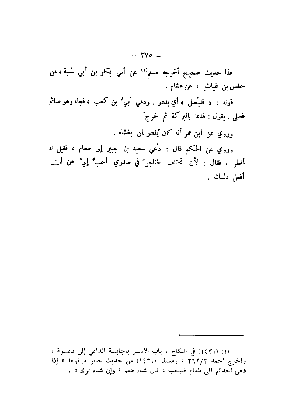 وَرُوِيَ عَنِ الْحَكَمِ، قَالَ: دُعِيَ سَعِيدُ بْنُ جُبَيْرٍ إِلَى طَعَامٍ، فَقِيلَ لَهُ: أَفْطِرْ، فَقَالَ: لأَنْ تَخْتَلِفَ الْخَنَاجِرُ فِي صَدْرِي أَحَبُّ إِلَيَّ مِنْ أَنْ أَفْعَلَ ذَلِكَ