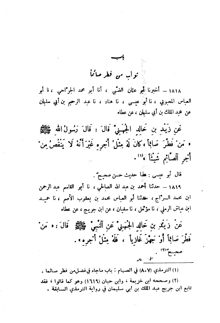 1818 - أَخْبَرَنَا أَبُو عُثْمَانَ الضَّبِّيُّ، أَنا أَبُو مُحَمَّدٍ الْجَرَّاحِيُّ، نَا أَبُو الْعَبَّاسِ الْمَحْبُوبِيُّ، نَا أَبُو عِيسَى، نَا هَنَّادٌ، نَا عَبْدُ الرَّحِيمِ بْنُ أَبِي سُلَيْمَانَ، عَنْ عَبْدِ الْمَلِكِ بْنِ أَبِي سُلَيْمَانَ، عَنْ عَطَاءٍ، عَنْ زَيْدِ بْنِ خَالِدٍ الْجُهَنِيِّ، قَالَ: قَالَ رَسُولُ اللَّهِ صَلَّى اللهُ عَلَيْهِ وَسَلَّمَ: «مَنْ فَطَّرَ صَائِمًا، كَانَ لَهُ أَجْرُهُ، غَيْرَ أَنَّهُ لَا يَنْقُصُ مِنْ أَجْرِ الصَّائِمِ شَيْئًا».