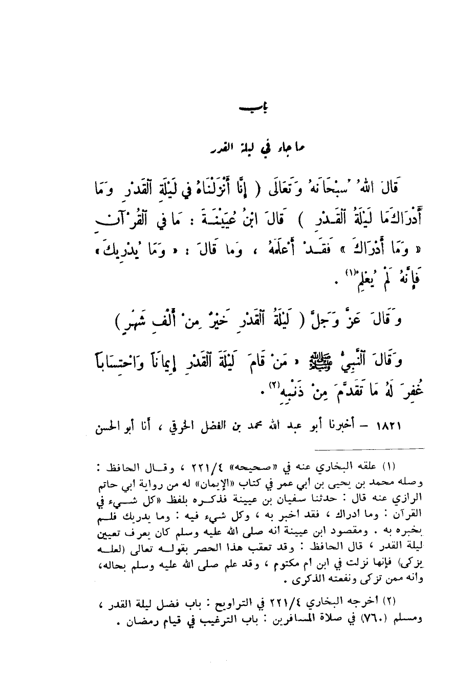 وَقَالَ النَّبِيُّ صَلَّى اللهُ عَلَيْهِ وَسَلَّمَ: «مَنْ قَامَ لَيْلَةَ الْقَدْرِ إِيمَانًا وَاحْتِسَابًا، غُفِرَ لَهُ مَا تَقَدَّمَ مِنْ ذَنْبِهِ».