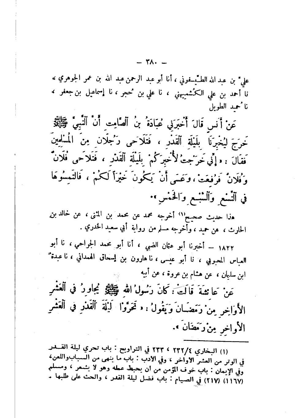عَلِيُّ بْنُ عَبْدِ اللَّهِ الطَّيْسَفُونِيُّ، أَنا أَبُو عَبْدِ الرَّحْمَنِ عَبْدُ اللَّهِ بْنُ عُمَرَ الْجَوْهَرِيُّ، نَا أَحْمَدُ بْنُ عَلِيٍّ الْكُشْمِيهَنِيُّ، نَا عَلِيُّ بْنُ حُجْرٍ، نَا إِسْمَاعِيلُ بْنُ جَعْفَرٍ، نَا حُمَيْدٌ الطَّوِيلُ، عَنْ أَنَسٍ، قَالَ: أَخْبَرَنِي عُبَادَةُ بْنُ الصَّامِتِ، أَنَّ النَّبِيَّ صَلَّى اللهُ عَلَيْهِ وَسَلَّمَ خَرَجَ لِيُخْبِرَنَا بِلَيْلَةِ الْقَدْرِ، فَتَلاحَى رَجُلانِ مِنَ الْمُسْلِمِينَ، فَقَالَ: «إِنِّي خَرَجْتُ لأُخْبِرَكُمْ بِلَيْلَةِ الْقَدْرِ، فَتَلاحَى فُلانٌ وَفُلانٌ، فَرُفِعَتْ، وَعَسَى أَنْ يَكُونَ خَيْرًا لَكُمْ، فَالْتَمِسُوهَا فِي التِّسْعِ وَالسَّبْعِ وَالْخَمْسِ».