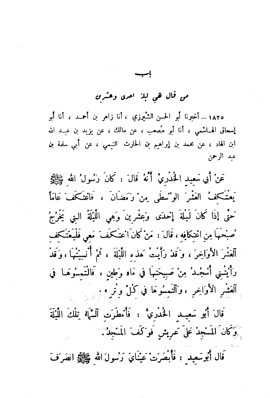 1825 - أَخْبَرَنَا أَبُو الْحَسَنِ الشِّيرَزِيُّ، أَنا زَاهِرُ بْنُ أَحْمَدَ، أَنا أَبُو إِسْحَاقَ الْهَاشِمِيُّ، أَنا أَبُو مُصْعَبٍ، عَنْ مَالِكٍ، عَنْ يَزِيدَ بْنِ عَبْدِ اللَّهِ بْنِ الْهَادِ، عَنْ مُحَمَّدِ بْنِ إِبْرَاهِيمَ بْنِ الْحَارِثِ التَّيْمِيِّ، عَنْ أَبِي سَلَمَةَ بْنِ عَبْدِ الرَّحْمَنِ، عَنْ أَبِي سَعِيدٍ الْخُدْرِيِّ، أَنَّهُ قَالَ: كَانَ رَسُولُ اللَّهِ صَلَّى اللهُ عَلَيْهِ وَسَلَّمَ يَعْتَكِفُ الْعَشْرَ الْوُسْطَى مِنْ رَمَضَانَ، فَاعْتَكَفَ عَامًا حَتَّى إِذَا كَانَتْ لَيْلَةُ إِحْدَى وَعِشْرِينَ، وَهِيَ اللَّيْلَةُ الَّتِي يَخْرُجُ صُبْحَهَا مِنَ اعْتِكافِهِ، قَالَ: «مَنْ كَانَ اعْتَكَفَ مَعِي، فَلْيَعْتَكِفِ الْعَشْرَ الأَوَاخِرَ، وَقَدْ رَأَيْتُ هَذِهِ اللَّيْلَةَ، ثُمَّ أُنْسِيتُهَا، وَقَدْ رَأَيْتُنِي أَسْجُدُ مِنْ صَبِيحَتِهَا فِي مَاءٍ وَطِينٍ، فَالْتَمِسُوهَا فِي الْعَشْرِ الأَوَاخِرِ، وَالْتَمِسُوهَا فِي كُلِّ وِتْرٍ».