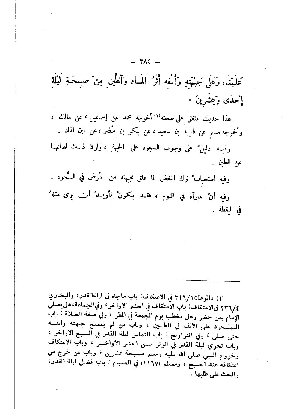 عَلَيْنَا، وَعَلَى جَبْهَتِهِ وَأَنْفِهِ أَثَرَ الْمَاءِ وَالطِّينِ مِنْ صَبِيحَةِ لَيْلَةِ إِحْدَى وَعِشْرِينَ.