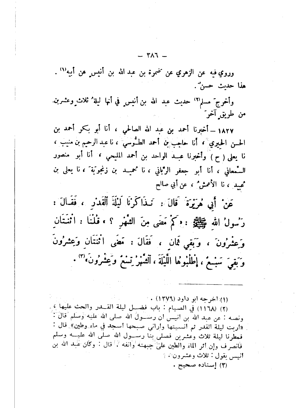 وَأَخْرَجَ مُسْلِمٌ حَدِيثَ عَبْدِ اللَّهِ بْنِ أُنَيْسٍ فِي أَنَّهَا لَيْلَةُ ثَلاثٍ وَعِشْرِينَ مِنْ طَرِيقٍ آخَرَ