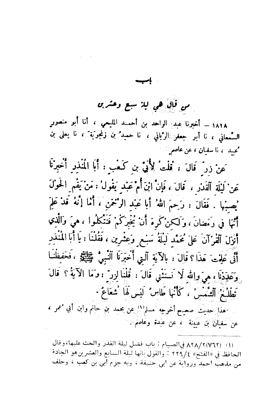 1828 - أَخْبَرَنَا عَبْدُ الْوَاحِدِ بْنُ أَحْمَدَ الْمَلِيحِيُّ، أَنا أَبُو مَنْصُورٍ السَّمْعَانِيُّ، نَا أَبُو جَعْفَرٍ الرَّيَّانِيُّ، نَا حُمَيْدُ بْنُ زَنْجُوَيْهِ، نَا يَعْلَى بْنُ عُبَيْدٍ، نَا سُفْيَانُ، عَنْ عَاصِمٍ، عَنْ زِرٍّ، قَالَ: قُلْتُ لأُبَيِّ بْنِ كَعْبٍ: " أَبَا الْمُنْذِرِ، أَخْبِرْنَا عَنْ لَيْلَةِ الْقَدْرِ، قَالَ: فَإِنَّ ابْنَ أُمِّ عَبْدٍ يَقُولُ: مَنْ يَقُمِ الْحَوْلَ يُصِبْهَا، فَقَالَ: رَحِمَ اللَّهُ أَبَا عَبْدِ الرَّحْمَنِ، أَمَا إِنَّهُ قَدْ عَلِمَ أَنَّهَا فِي رَمَضَانَ، وَلَكِنْ كَرِهَ أَنْ يُخْبِرَكُمْ، فَتَتَّكِلُوا، هِيَ وَالَّذِي أَنْزَلَ الْقُرْآنَ عَلَى مُحَمَّدٍ لَيْلَةُ سَبْعٍ وَعِشْرِينَ، فَقُلْنَا: يَا أَبَا الْمُنْذِرِ، أَنَّى عَلِمْتَ هَذَا؟ قَالَ: بِالآيَةِ الَّتِي أَخْبَرَنَا النَّبِيُّ صَلَّى اللهُ عَلَيْهِ وَسَلَّمَ، فَحَفِظْنَا وَعَدَدْنَا، هِيَ وَاللَّهِ لَا نَسْتَثْنِي، قَالَ: قُلْنَا لِزِرٍّ: وَمَا الآيَةُ؟ قَالَ: تَطْلُعُ الشَّمْسُ، كَأَنَّهَا طَاسٌ، لَيْسَ لَهَا شُعَاعٌ ".