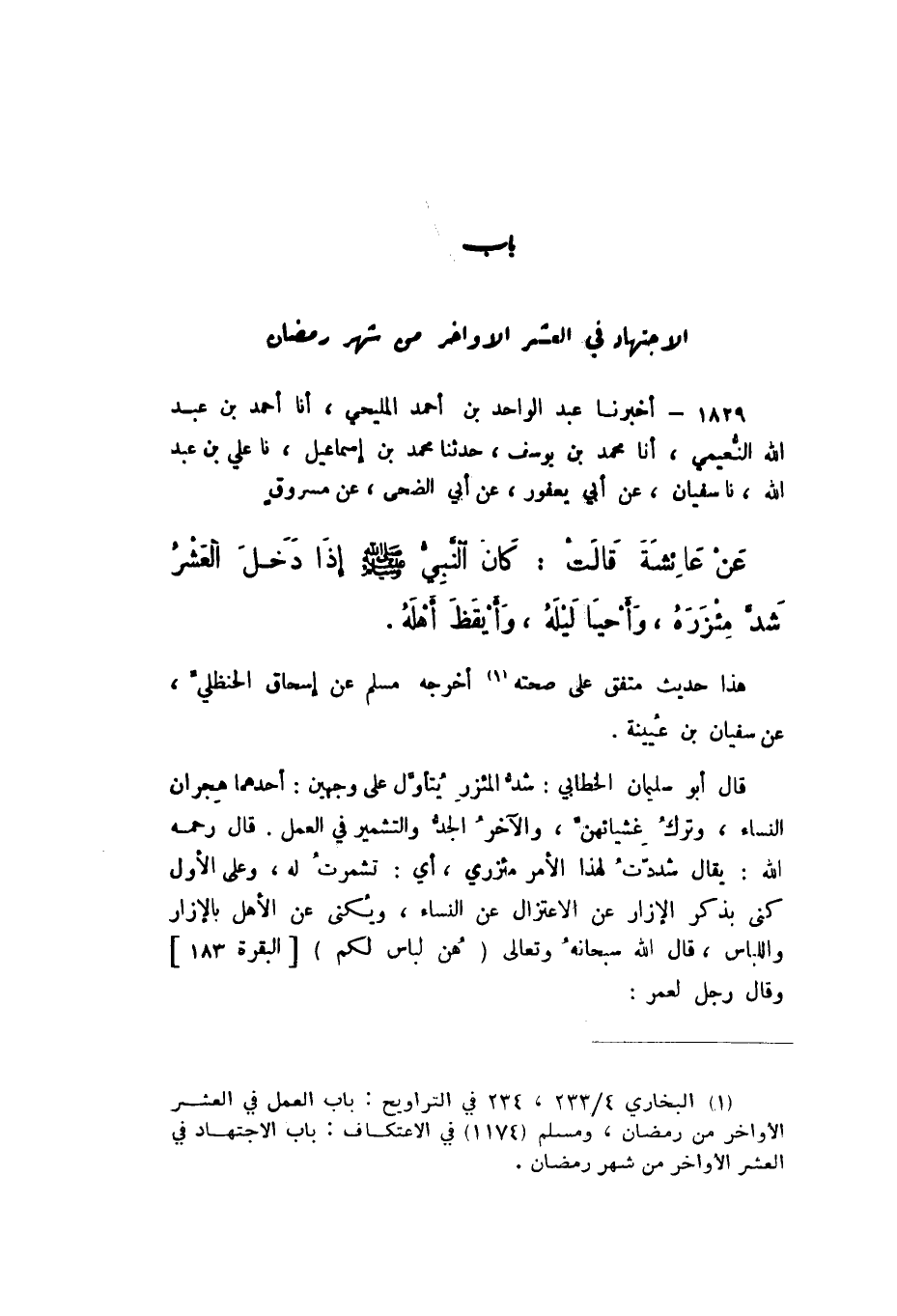 1829 - أَخْبَرَنَا عَبْدُ الْوَاحِدِ بْنُ أَحْمَدَ الْمَلِيحِيُّ، أَنا أَحْمَدُ بْنُ عَبْدِ اللَّهِ النُّعَيْمِيُّ، أَنا مُحَمَّدُ بْنُ يُوسُفَ، حَدَّثَنَا مُحَمَّدُ بْنُ إِسْمَاعِيلَ، نَا عَلِيُّ بْنُ عَبْدِ اللَّهِ، نَا سُفْيَانُ، عَنْ أَبِي يَعْفُورَ، عَنْ أَبِي الضُّحَى، عَنْ مَسْرُوقٍ، عَنْ عَائِشَةَ، قَالَتْ: «كَانَ النَّبِيُّ صَلَّى اللهُ عَلَيْهِ وَسَلَّمَ إِذَا دَخَلَ الْعَشْرُ شَدَّ مِئْزَرَهُ، وَأَحْيَا لَيْلَهُ، وَأَيْقَظَ أَهْلَهُ».