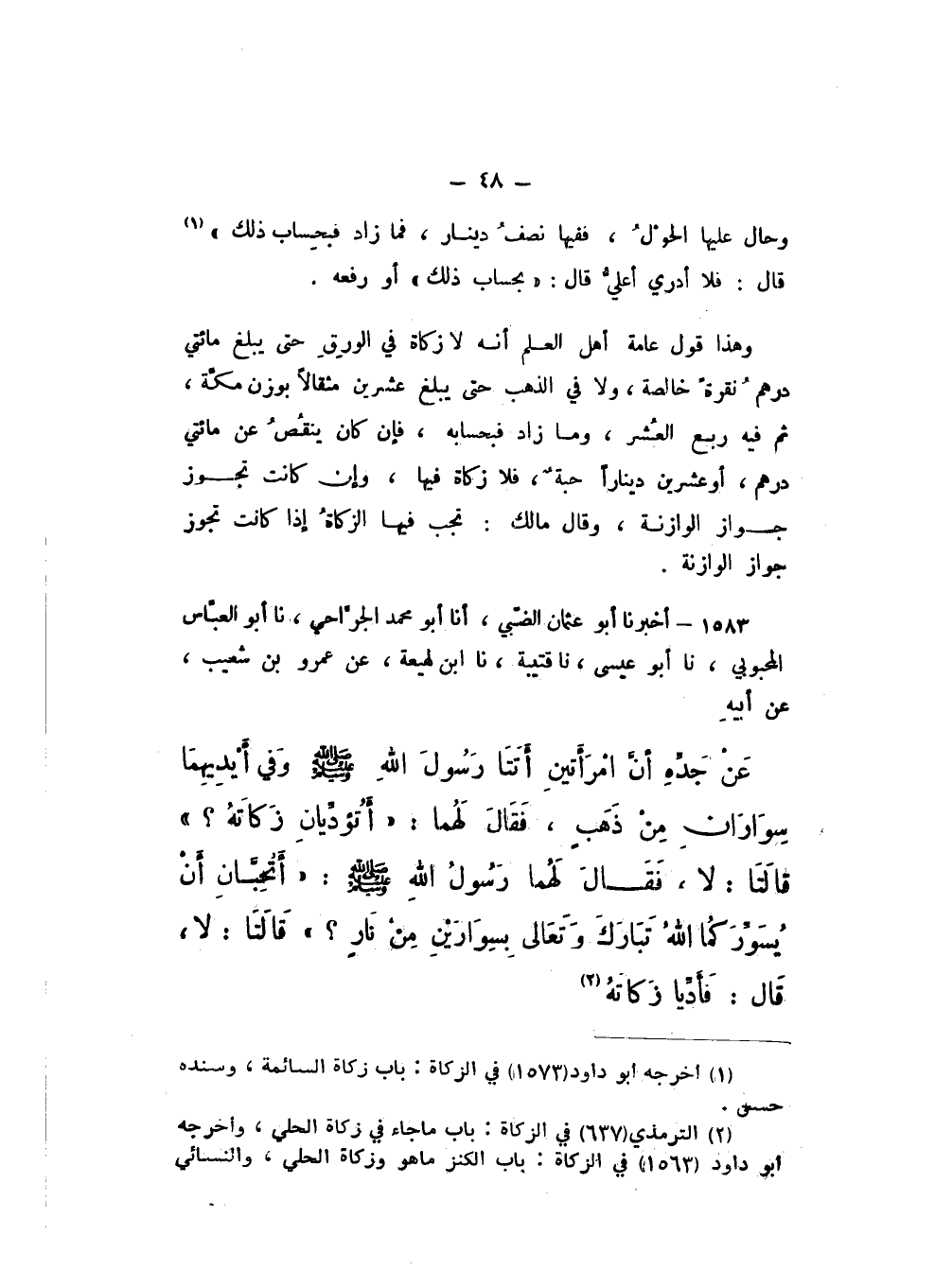 1583 - أَخْبَرَنَا أَبُو عُثْمَانَ الضَّبِّيُّ، أَنا أَبُو مُحَمَّدٍ الْجَرَّاحِيُّ، نَا أَبُو الْعَبَّاسِ الْمَحْبُوبِيُّ، نَا أَبُو عِيسَى، نَا قُتَيْبَةُ، نَا ابْنُ لَهِيعَةَ، عَنْ عَمْرِو بْنِ شُعَيْبٍ، عَنْ أَبِيهِ، عَنْ جَدِّهِ، أَنَّ امْرَأَتَيْنِ أَتَتَا رَسُولَ اللَّهِ صَلَّى اللهُ عَلَيْهِ وَسَلَّمَ وَفِي أَيْدِيهِمَا سِوَارَانِ مِنْ ذَهَبٍ، فَقَالَ لَهُمَا: «أَتُؤَدِّيَانِ زَكَاتَهُ؟»، قَالَتَا: لَا، فَقَالَ لَهُمَا رَسُولُ اللَّهِ صَلَّى اللهُ عَلَيْهِ وَسَلَّمَ: «أَتُحِبَّانِ أَنْ يُسَوِّرَكُمَا اللَّهُ تَبَارَكَ وَتَعَالَى بِسِوَارَيْنِ مِنْ نَارٍ؟»، قَالَتَا: لَا، قَالَ: «فَأَدِّيَا زَكَاتَهُ».