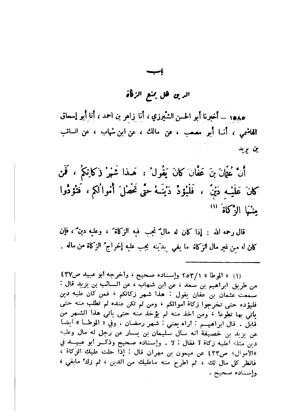 1585 - أَخْبَرَنَا أَبُو الْحَسَنِ الشِّيرَزِيُّ، أَنا زَاهِرُ بْنُ أَحْمَدَ، أَنا أَبُو إِسْحَاقَ الْهَاشِمِيُّ، أَنا أَبُو مُصَعْبٍ، عَنْ مَالِكٍ، عَنِ ابْنِ شِهَابٍ، عَنِ السَّائِبِ بْنِ يَزِيدَ، أنَّ عُثْمَانَ بْنَ عَفَّانَ، كَانَ يَقُولُ: «هَذَا شَهْرُ زَكَاتِكُمْ، فَمَنْ كَانَ عَلَيْهِ دَيْنٌ، فَلْيُؤَدِّ دَيْنَهُ حَتَّى تَحْصُلَ أَمْوَالُكُمْ، فَتُؤَدُّوا مِنْهَا الزَّكَاةَ»