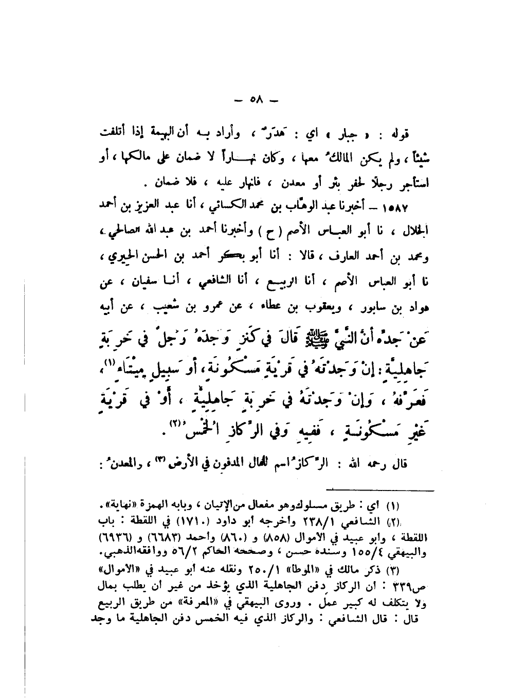 ح وَأَخْبَرَنَا أَحْمَدُ بْنُ عَبْدِ اللَّهِ الصَّالِحِيُّ، وَمُحَمَّدُ بْنُ أَحْمَدَ الْعَارِفُ، قَالا: أَنا أَبُو بَكْرٍ أَحْمَدُ بْنُ الْحَسَنِ الْحِيرِيُّ، نَا أَبُو الْعَبَّاسِ الْأَصَمُّ، أَنا الرَّبِيعُ، أَنا الشَّافِعِيُّ، أَنا سُفْيَانُ، عَنْ هَوَّادِ بْنِ سَابُورٍ، وَيَعْقُوبُ بْنُ عَطَاءٍ، عَنْ عَمْرِو بْنِ شُعَيْبٍ، عَنْ أَبِيهِ، عَنْ جَدِّهِ، أَنّ النَّبِيَّ صَلَّى اللهُ عَلَيْهِ وَسَلَّمَ، قَالَ فِي كَنْزٍ وَجَدَهُ رَجُلٌ فِي خَرِبَةٍ جَاهِلِيَّةٍ: «إِنْ وَجَدْتَهُ فِي قَرْيَةٍ مَسْكُونَةٍ، أَوْ سَبِيلٍ مِيتَاءٍ، فَعَرِّفْهُ، وَإِنْ وَجَدْتَهُ فِي خَرِبَةٍ جَاهِلِيَّةٍ، أَوْ فِي قَرْيَةٍ غَيْرِ مَسْكُونَةَ، فَفِيهِ وَفِي الرِّكَازِ الْخُمُسُ»