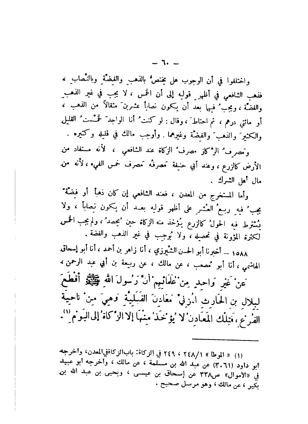 1588 - أَخْبَرَنَا أَبُو الْحَسَنِ الشِّيرزيُّ، أَنا زَاهِرُ بْنُ أَحْمَدَ، أَنا أَبُو إِسْحَاقَ الْهَاشِمِيُّ، أَنا أَبُو مُصْعَبٍ، عَنْ مَالِكٍ، عَنْ رَبِيعَةَ بْنِ أَبِي عَبْدِ الرَّحْمَنِ، عَنْ غَيْرِ وَاحِدٍ مِنْ عُلَمَائِهِمْ، أَنَّ رَسُولَ اللَّهِ صَلَّى اللهُ عَلَيْهِ وَسَلَّمَ «أَقْطَعَ لِبِلالِ بْنِ الْحَارِثِ الْمُزَنِيِّ مَعَادنَ الْقَبَلِيَّةِ وَهِيَ مِنْ نَاحِيَةِ الْفُرْعِ، فَتِلْكَ الْمَعَادِنُ لَا يُؤخَذُ مِنْهَا الزَّكَاةُ إِلَى الْيَوْمِ».