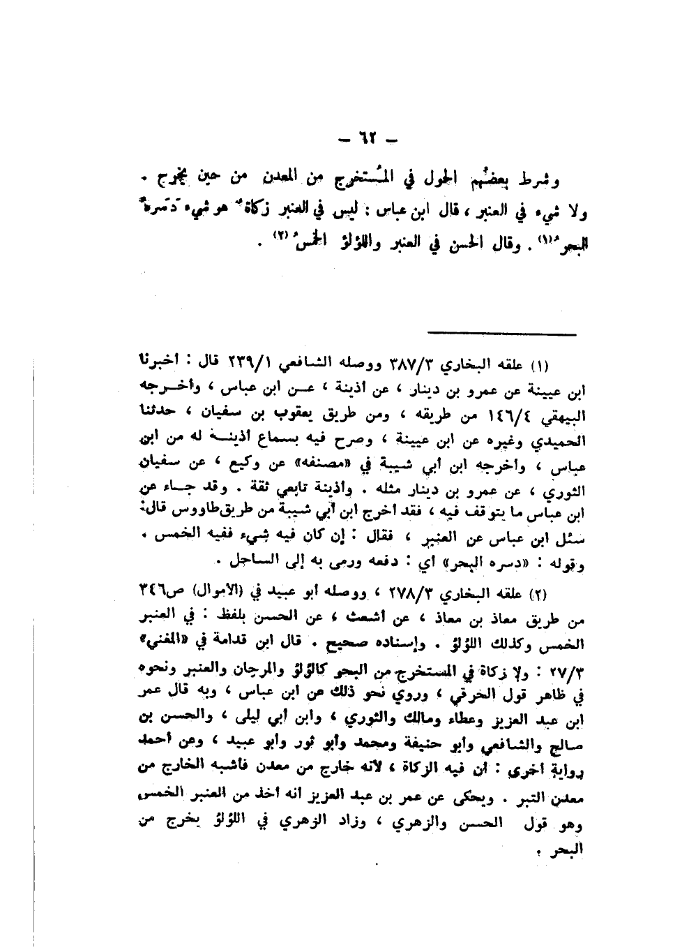 وَشَرَطَ بَعْضُهُمُ الْحَوْلَ فِي الْمُسْتَخْرَجِ مِنَ الْمَعْدَنِ مِنْ حِينِ يَخْرُجُ، وَلا شَيْءَ فِي الْعَنْبَرِ، قَالَ ابْنُ عَبَّاسٍ: لَيْسَ فِي الْعَنْبَرِ زَكَاةٌ، هُوَ شَيْءٌ دَسَرَهُ الْبَحْرُ.