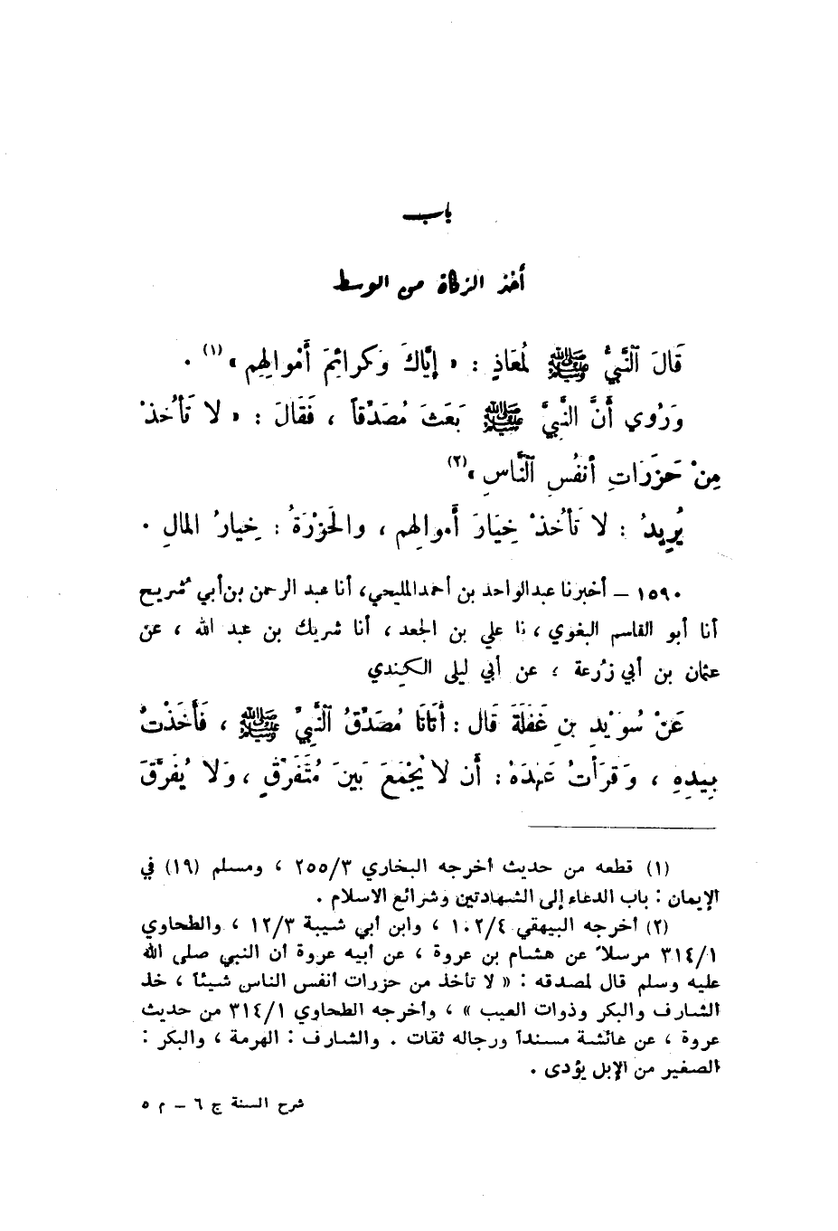 1590 - أَخْبَرَنَا عَبْدُ الْوَاحِدِ بْنُ أَحْمَدَ الْمَلِيحِيُّ، أَنا عَبْدُ الرَّحْمَنِ بْنُ أَبِي شُرَيْحٍ، أَنا أَبُو الْقَاسِمِ الْبَغَوِيُّ، نَا عَلِيُّ بْنُ الْجَعْدِ، أَنا شَرِيكُ بْنُ عَبْدِ اللَّهِ، عَنْ عُثْمَانَ بْنِ أَبِي زُرْعَةَ، عَنْ أَبِي لَيْلَى الْكِنْدِيِّ، عَنْ سُوَيْدِ بْنِ غَفْلَةَ، قَالَ: أَتَانَا مُصَدِّقُ النَّبِيِّ صَلَّى اللهُ عَلَيْهِ وَسَلَّمَ، فَأَخَذْتُ بِيَدِهِ، وَقَرَأْتُ عَهْدَهُ: أَنْ لَا يَجْمَعَ بَيْنَ مُتَفَرِّقٍ، وَلا يُفَّرقَ