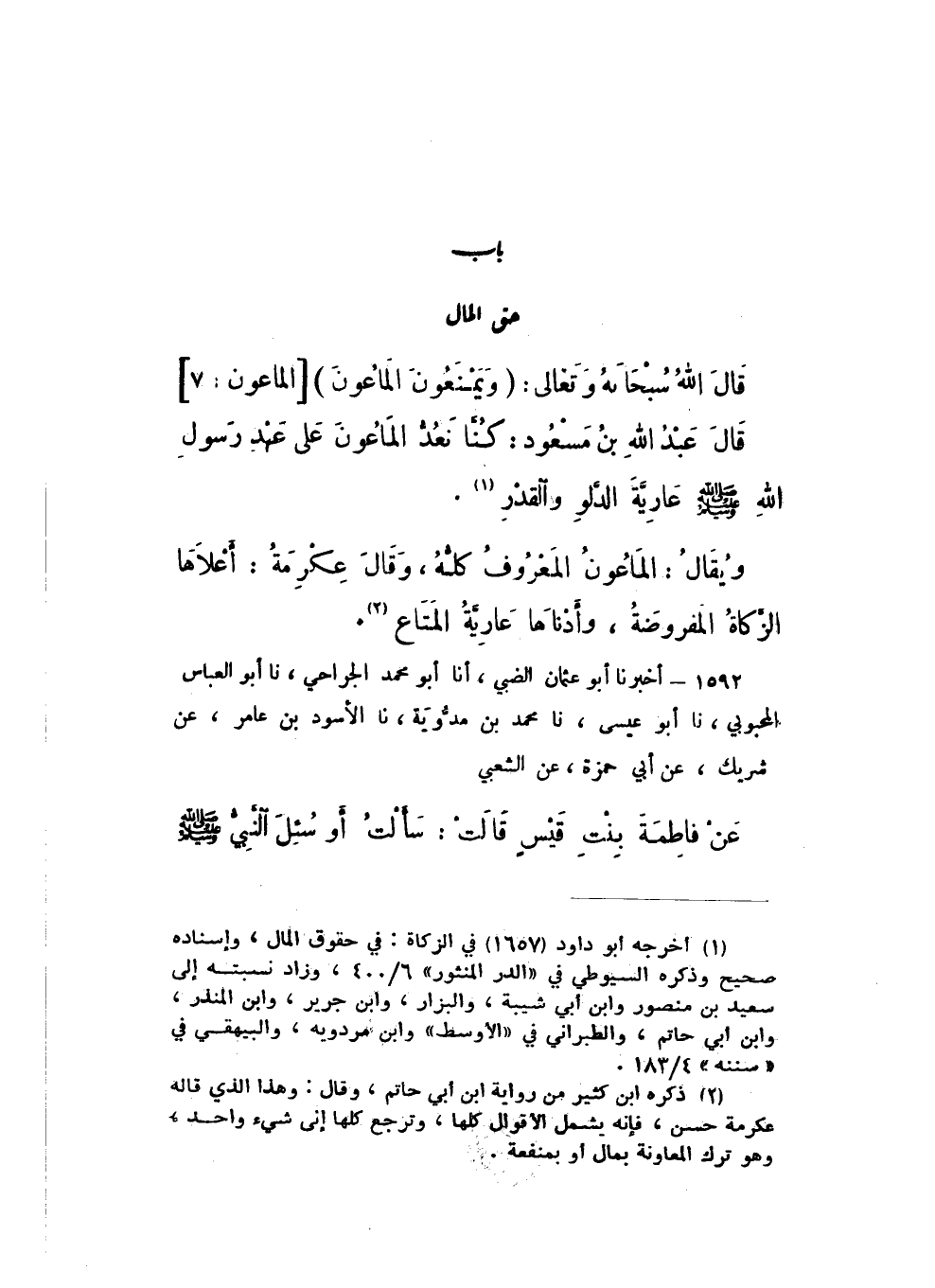 قَالَ عَبْدُ اللَّهِ بْنُ مَسْعُودٍ: كُنَّا نُعُدُّ الْمَاعُونَ عَلَى عَهْدِ رَسُولِ اللَّهِ صَلَّى اللهُ عَلَيْهِ وَسَلَّمَ عَارِيَةَ الدَّلْوِ وَالْقِدْرِ.