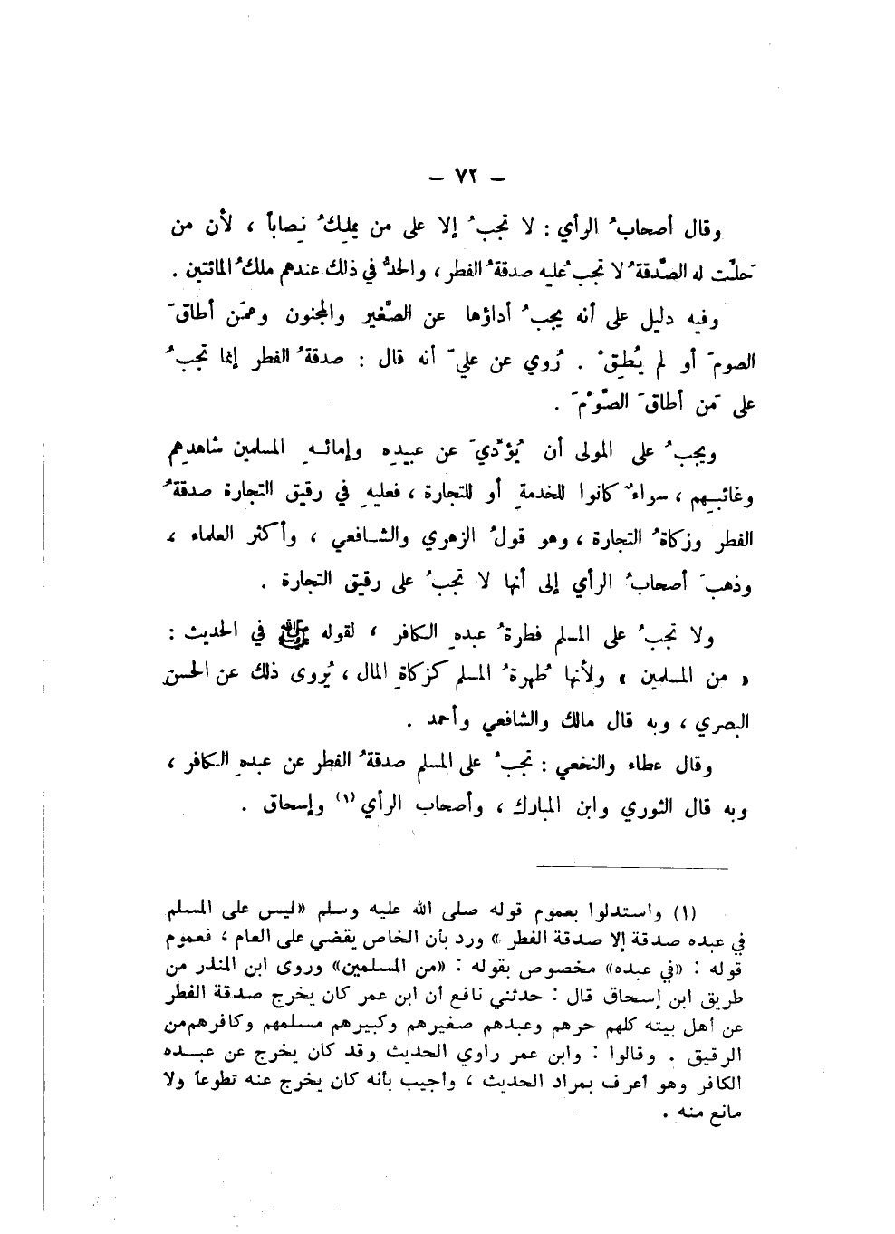 وَيَجِبُ عَلَى الْمَوْلَى أَنْ يُؤَدِّيَ عَنْ عَبِيدِهِ وَإِمَائِهِ الْمُسْلِمِينَ شَاهَدِهِمْ وَغَائِبِهِمْ، سَوَاءٌ كَانُوا لِلْخِدْمَةِ أَوْ لِلتِّجَارَةِ، فَعَلَيْهِ فِي رَقِيقِ التِّجَارَةِ صَدَقَةُ الْفِطْرِ وَزَكَاةُ التِّجَارَةِ، وَهُوَ قَوْلُ الزُّهْرِيِّ، وَالشَّافِعِيِّ، وَأَكْثَرِ الْعُلَمَاءِ، وَذَهَبَ أَصْحَابُ الرَّأْيِ إِلَى أَنَّهَا لَا تَجِبُ عَلَى رَقِيقِ التِّجَارَةِ.