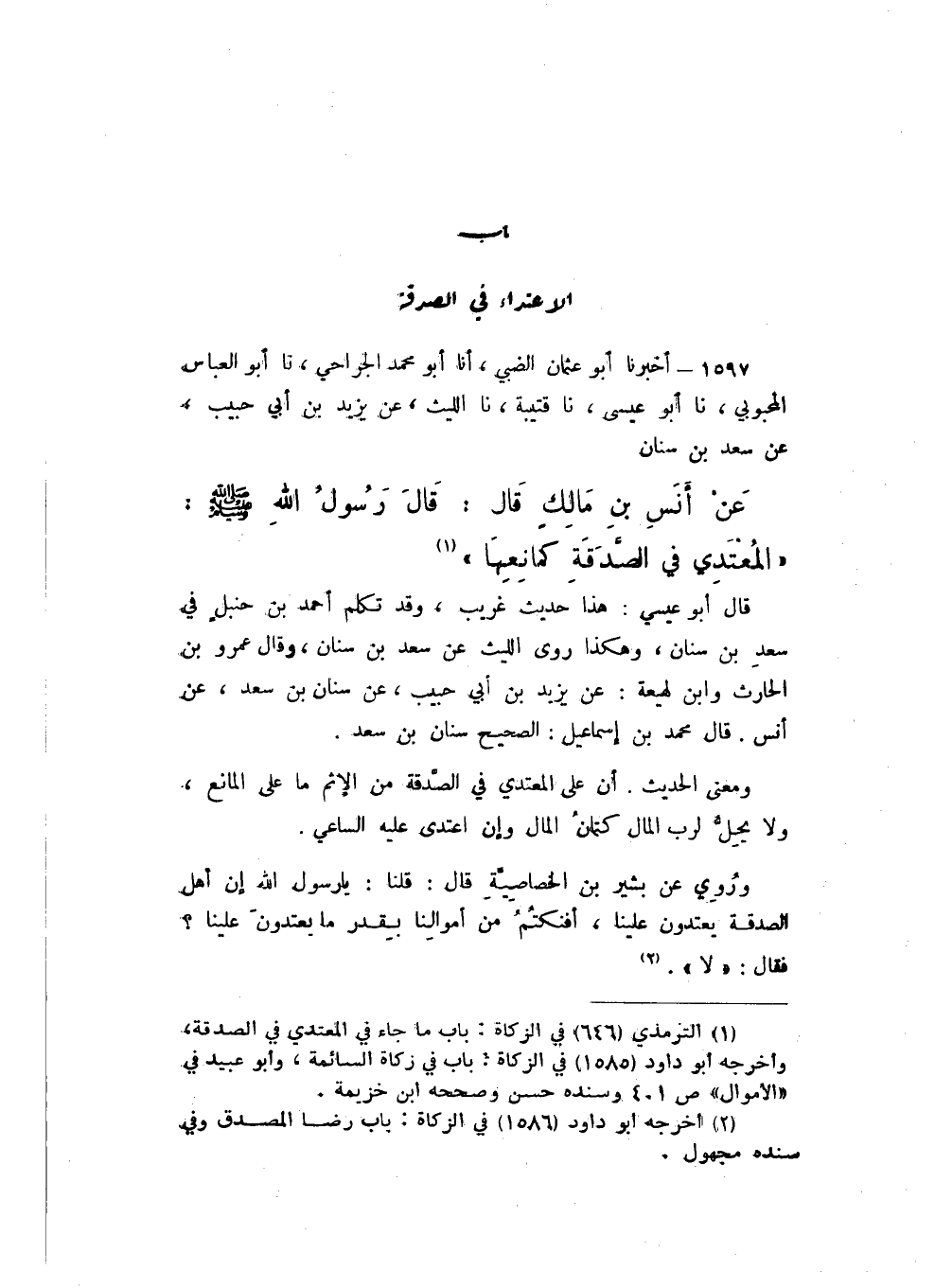 1597 - أَخْبَرَنَا أَبُو عُثْمَانَ الضَّبِيُّ، أَنا أَبُو مُحَمَّدٍ الْجَرَّاحِيُّ، نَا أَبُو الْعَبَّاسِ الْمَحْبُوبِيُّ، نَا أَبُو عِيسَى، نَا قُتَيْبَةُ، نَا اللَّيْثُ، عَنْ يَزِيدَ بْنِ أَبِي حَبِيبٍ، عَنْ سَعْدِ بْنِ سِنَانٍ، عَنْ أَنَسِ بْنِ مَالِكٍ، قَالَ: قَالَ رَسُولُ اللَّهِ صَلَّى اللهُ عَلَيْهِ وَسَلَّمَ: «الْمُعْتَدِي فِي الصَّدَقَةِ كَمَانِعِهَا».